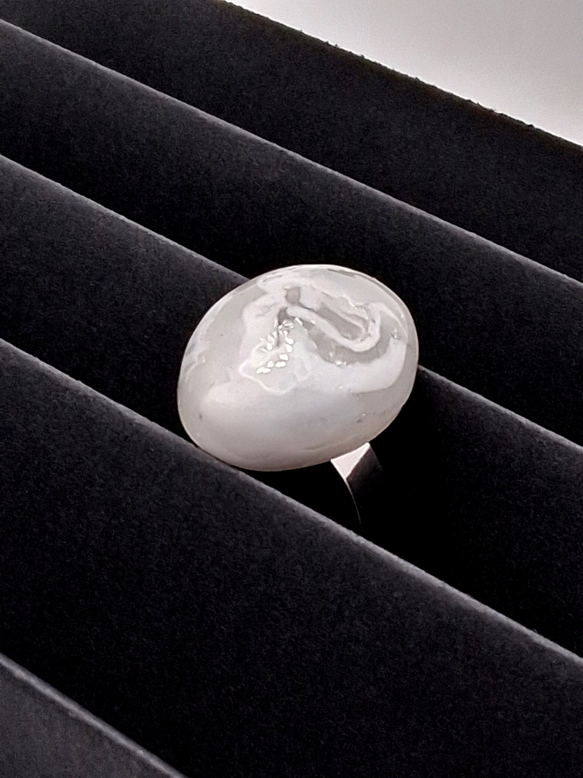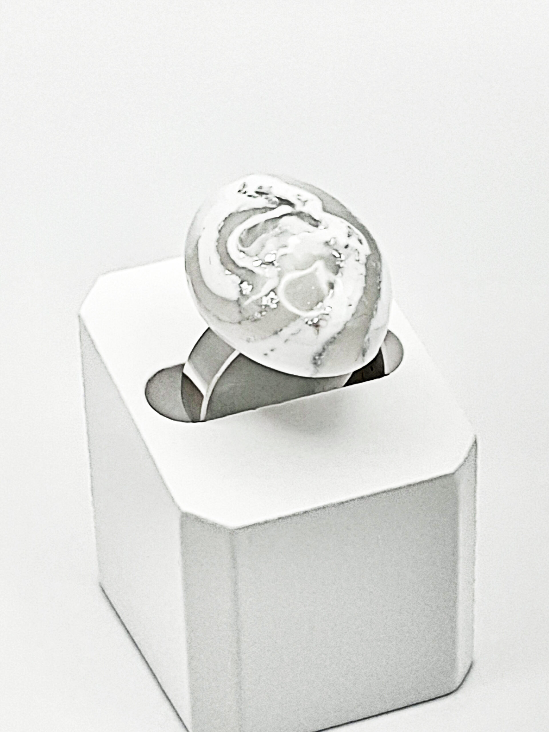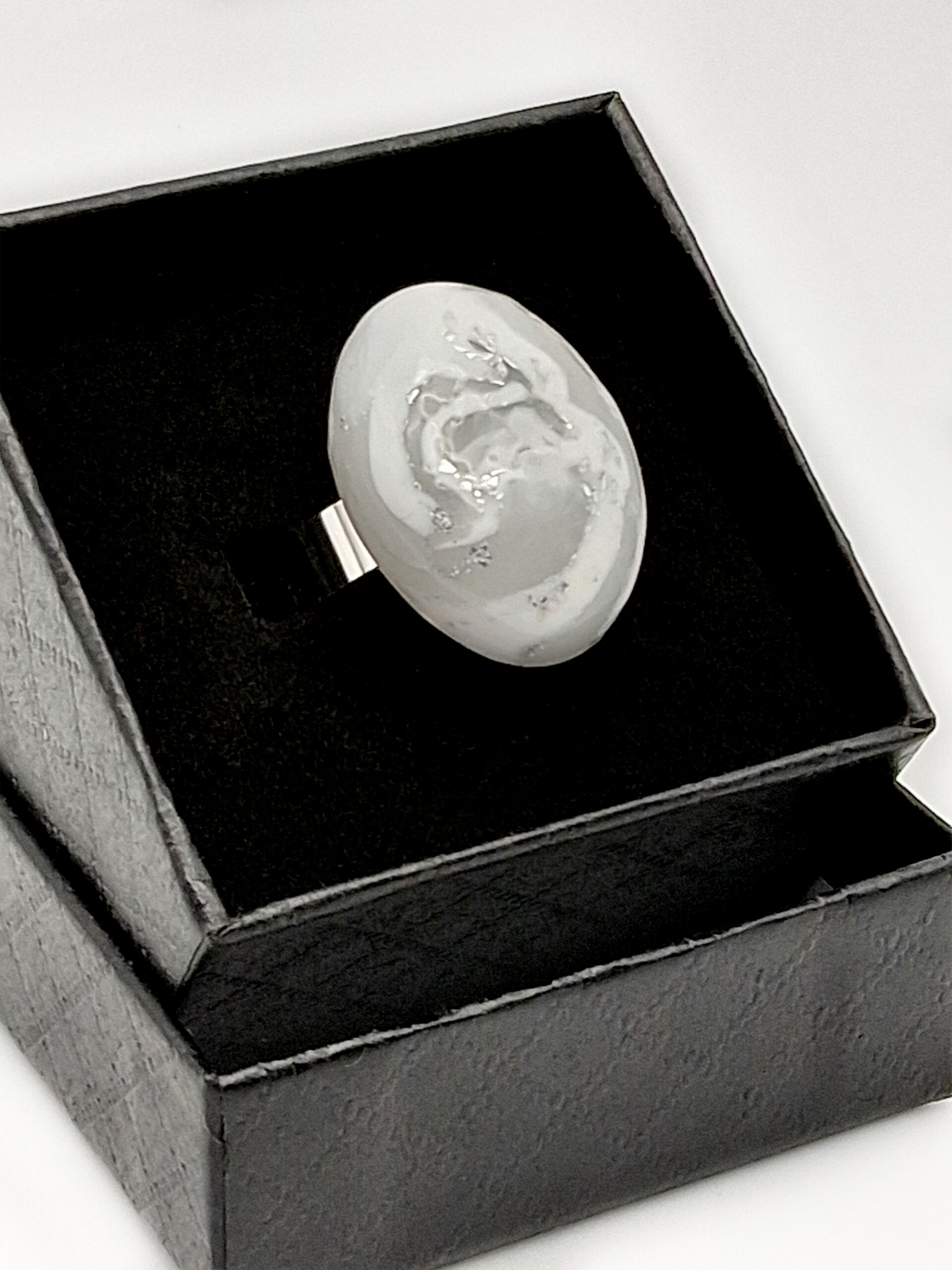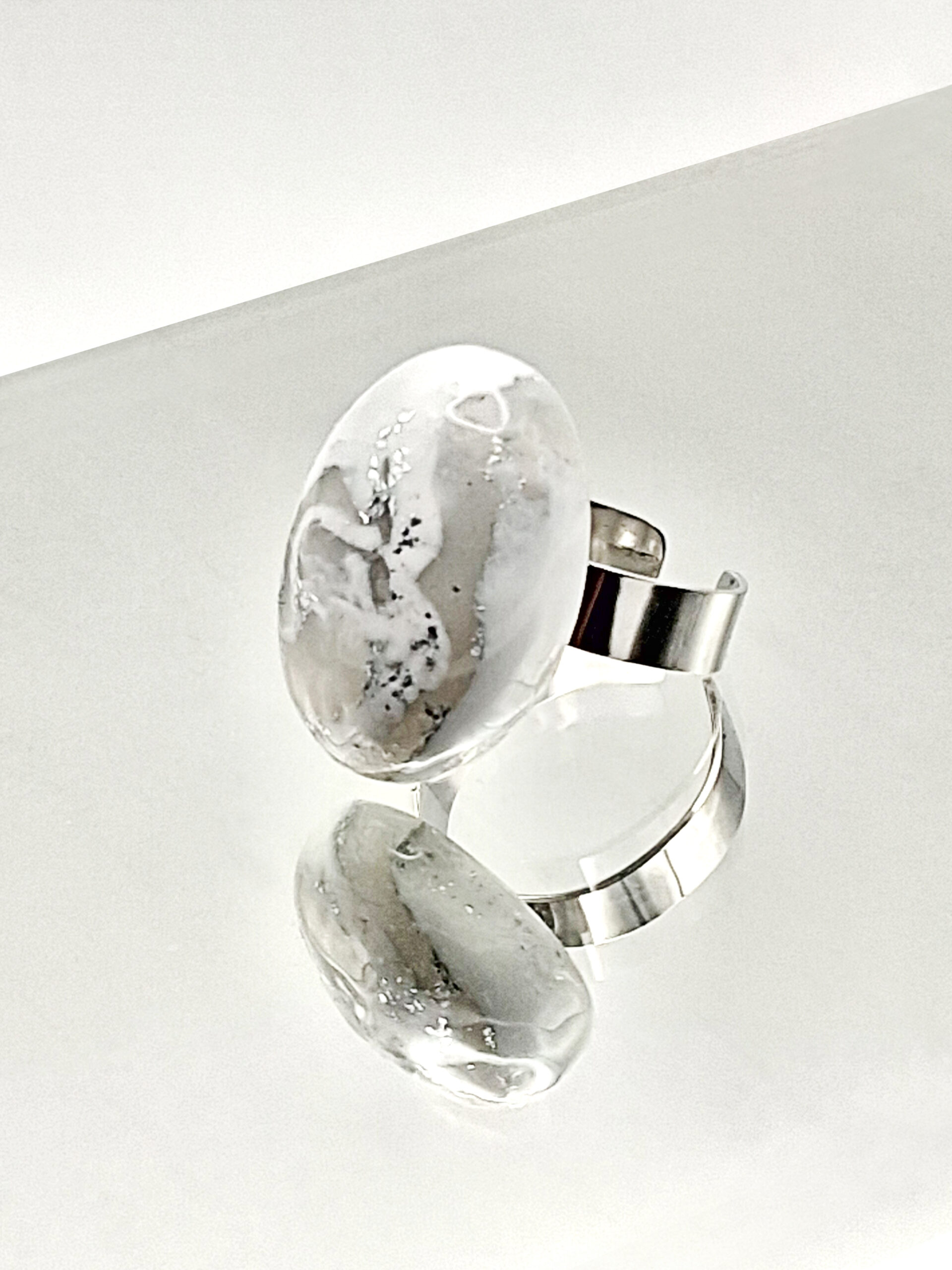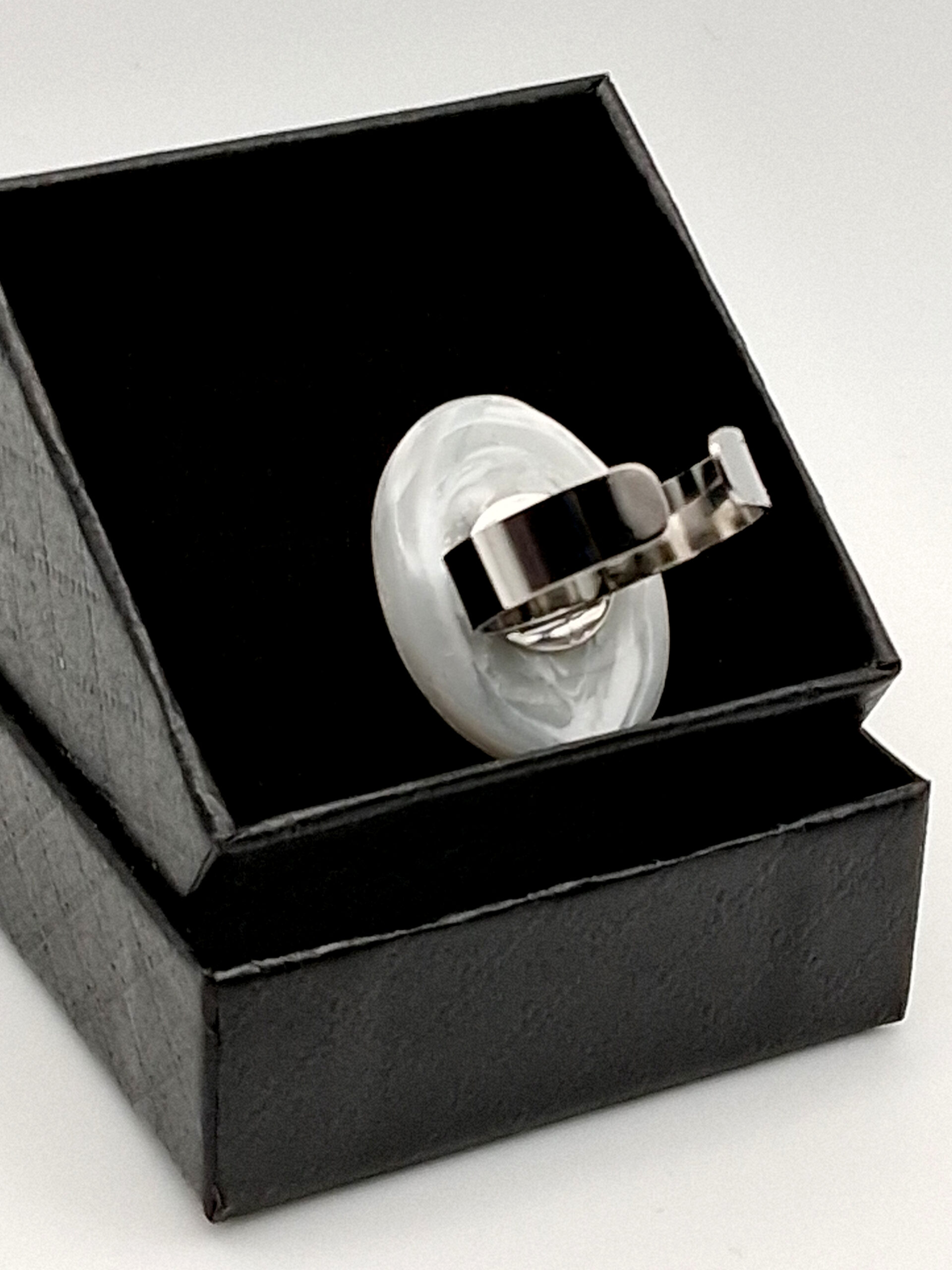 Une bague faite d’une jolie perle ovale, de belle taille, en argile polymère chamarrée blanche. Monture argent en acier inoxydable hypoallergénique ajustable.