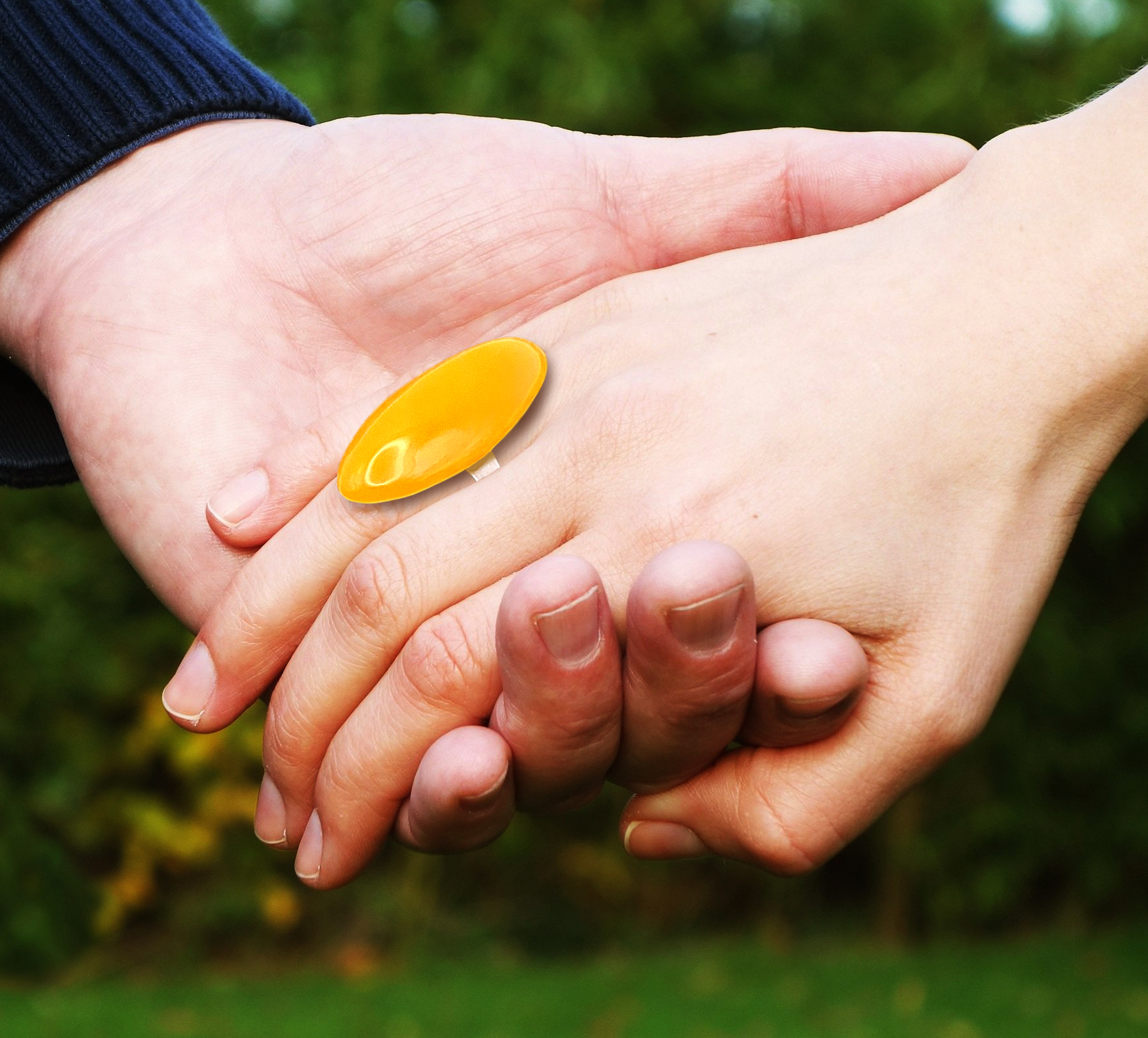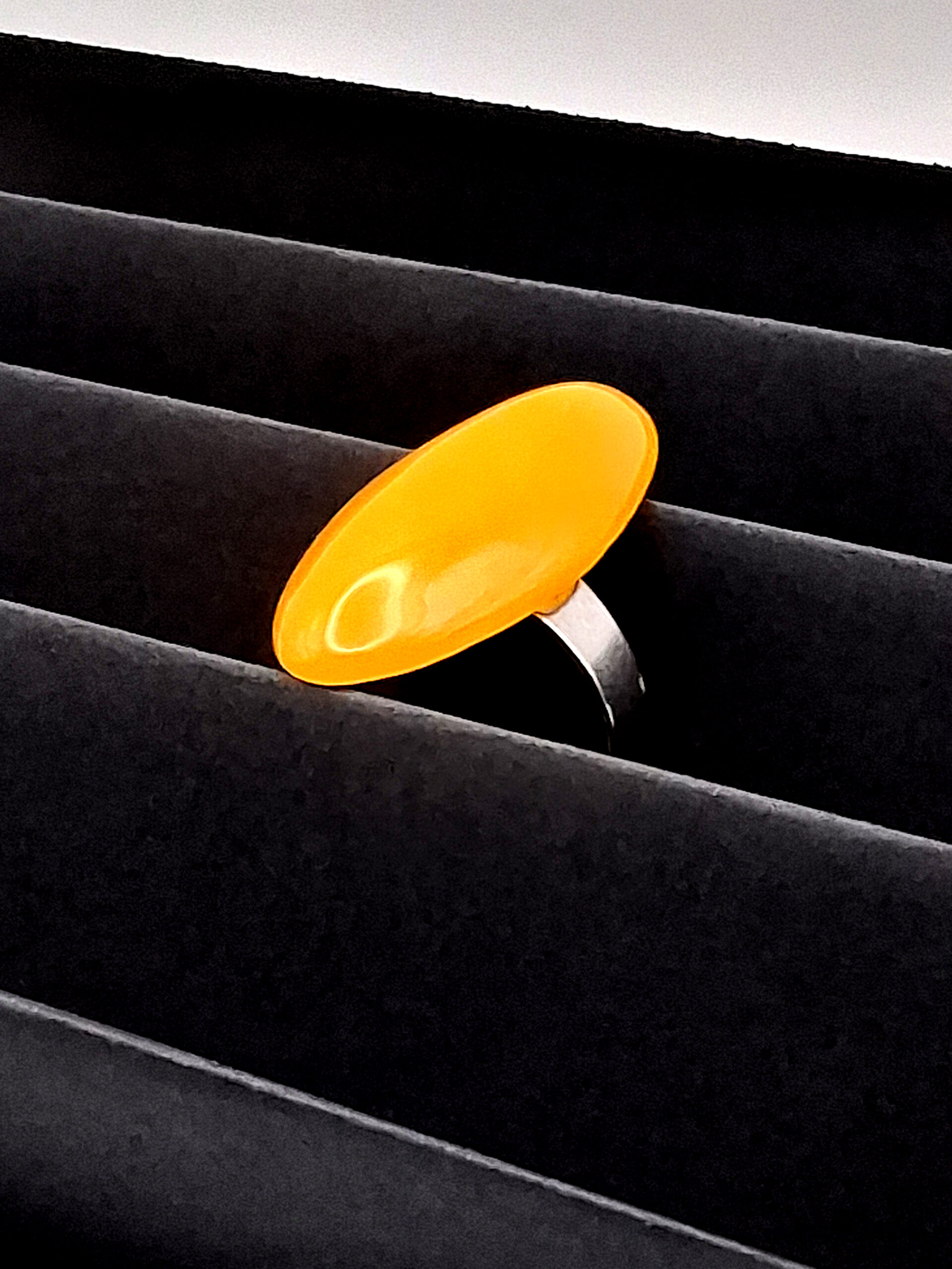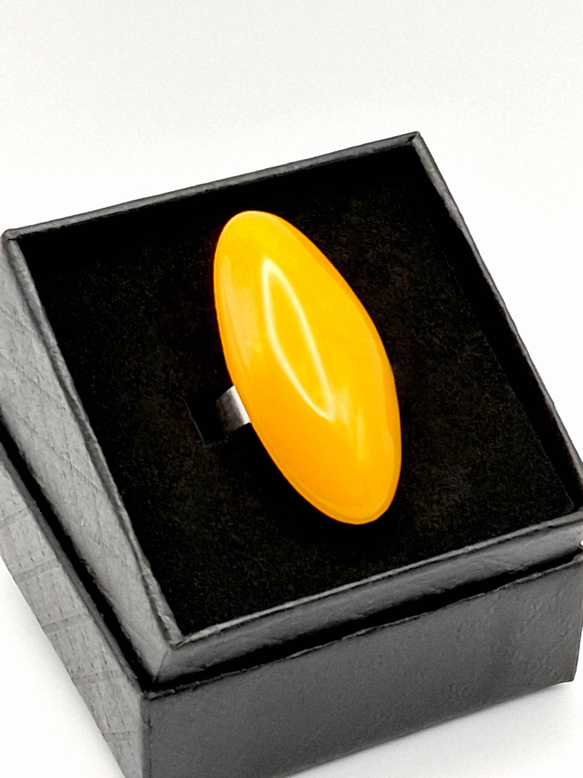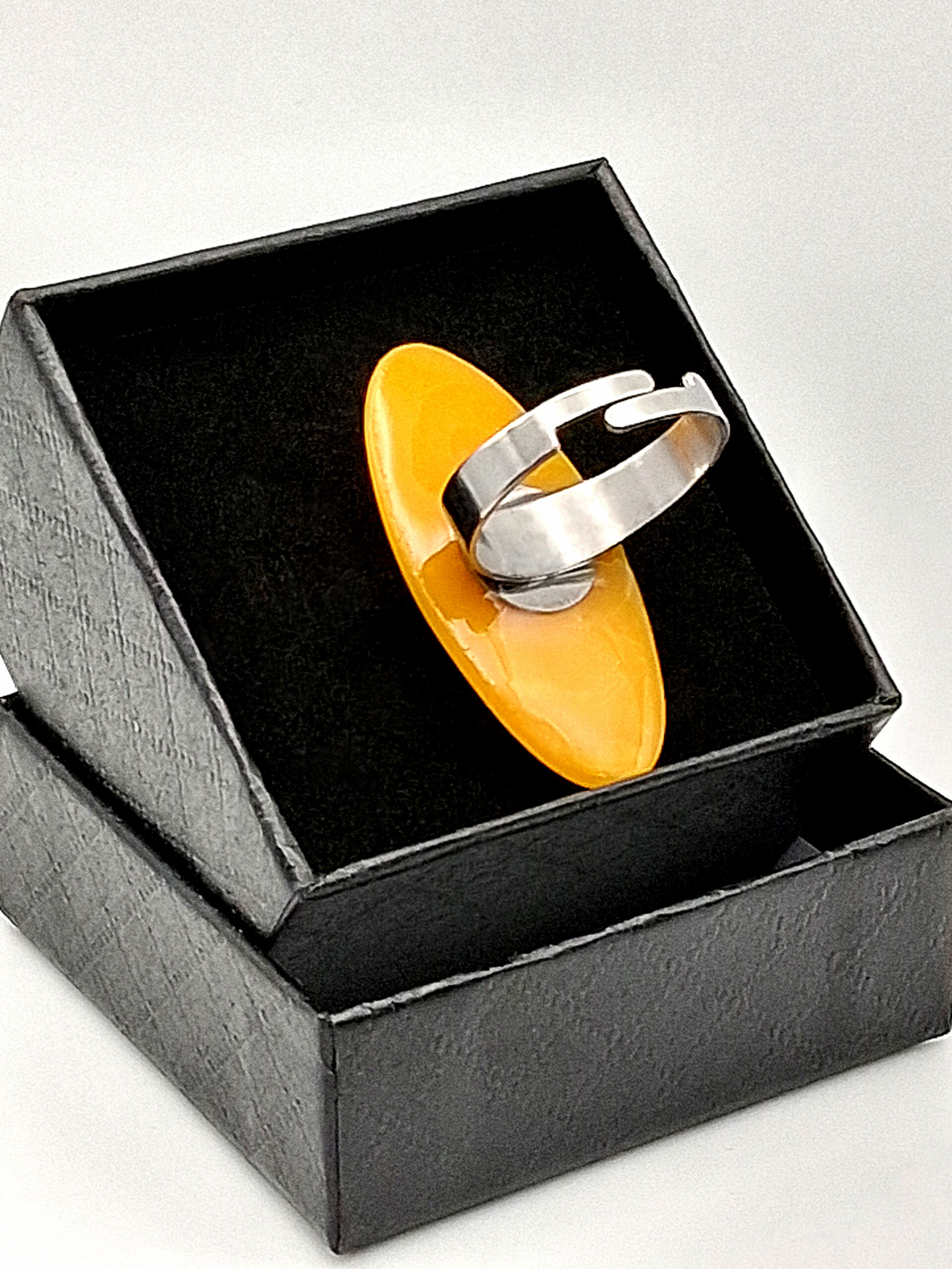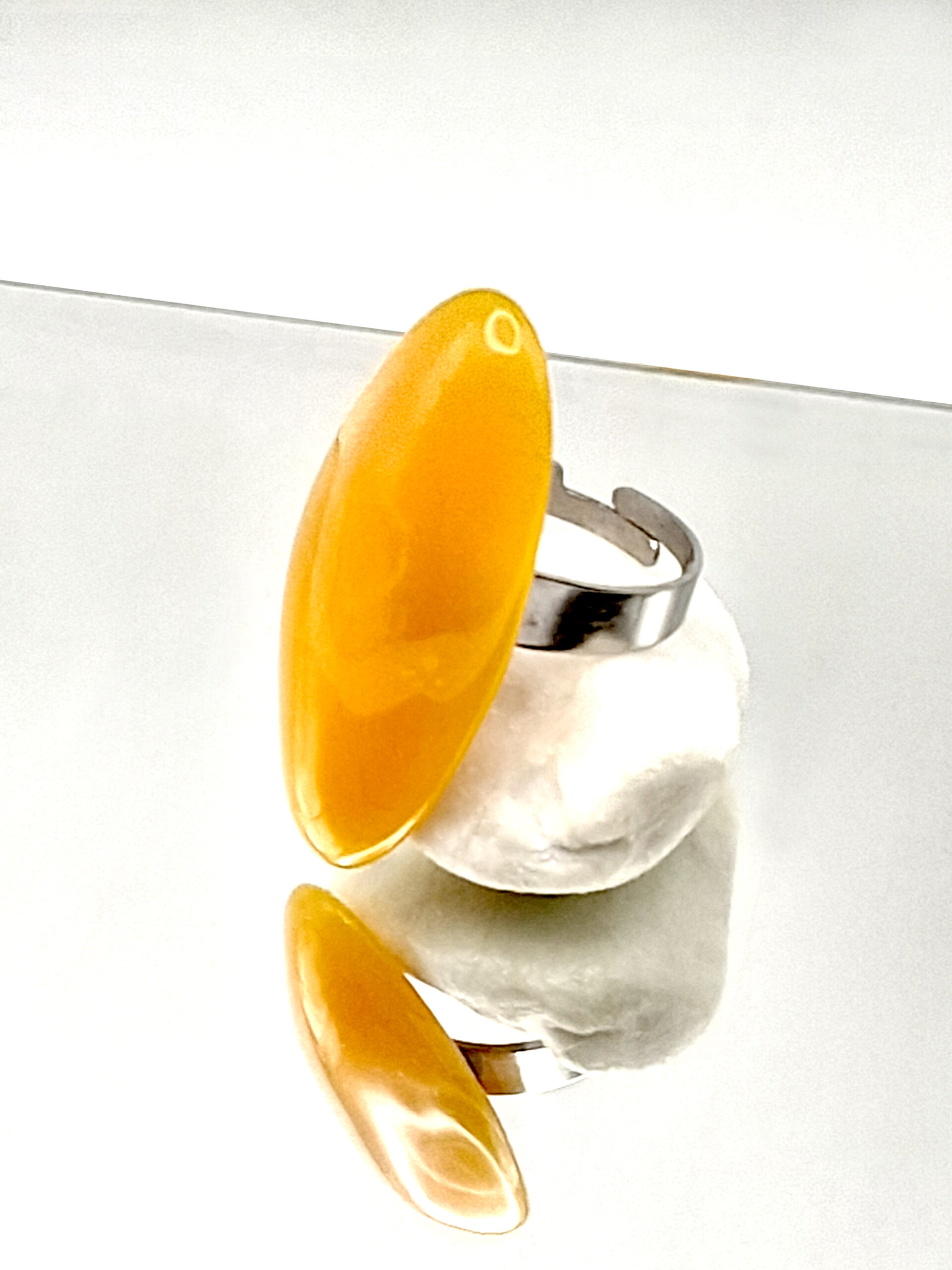 Une bague faite d’une jolie perle ovale, de belle taille, en argile polymère jaune lumineux. Monture argent en acier inoxydable hypoallergénique ajustable.