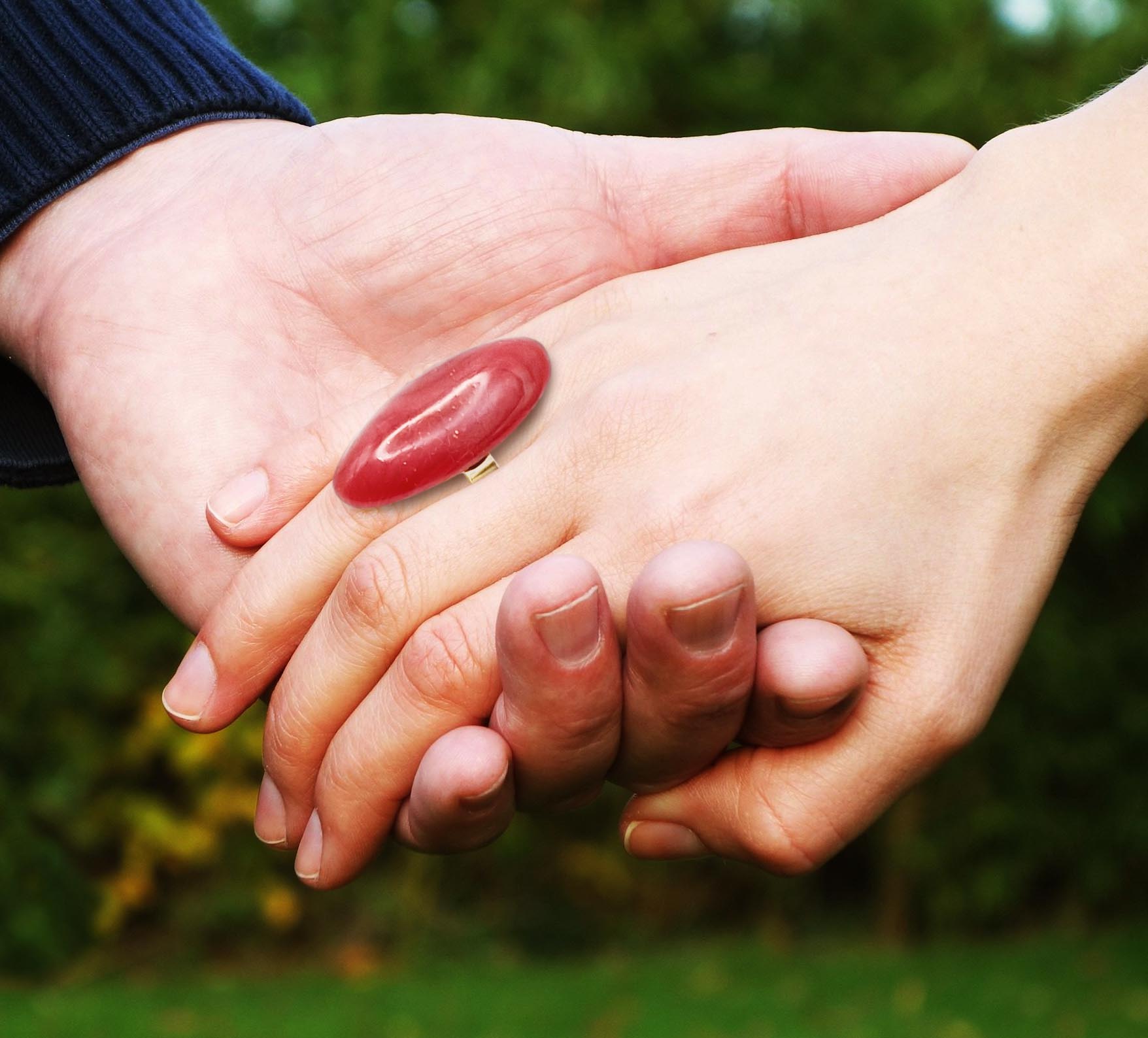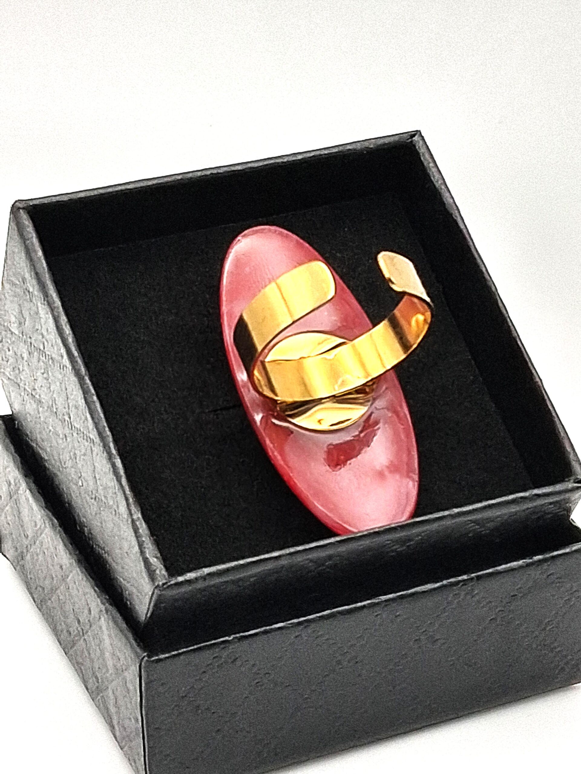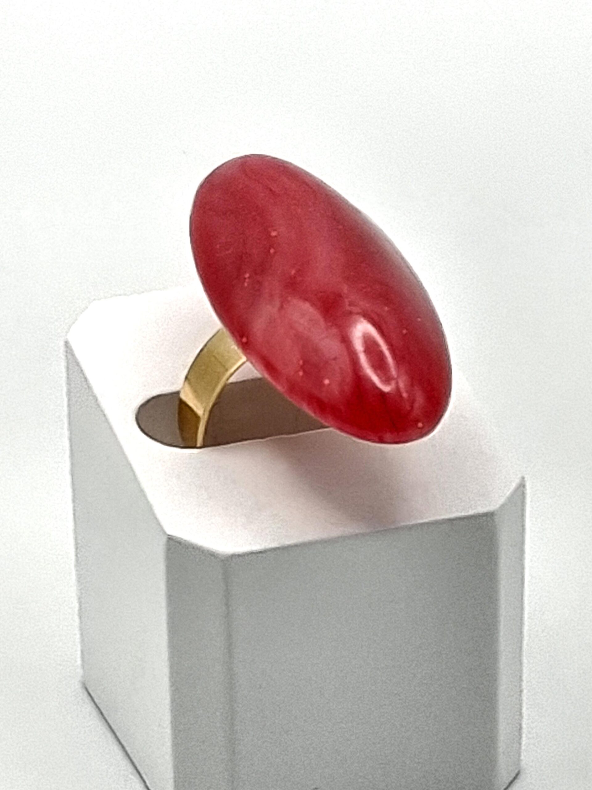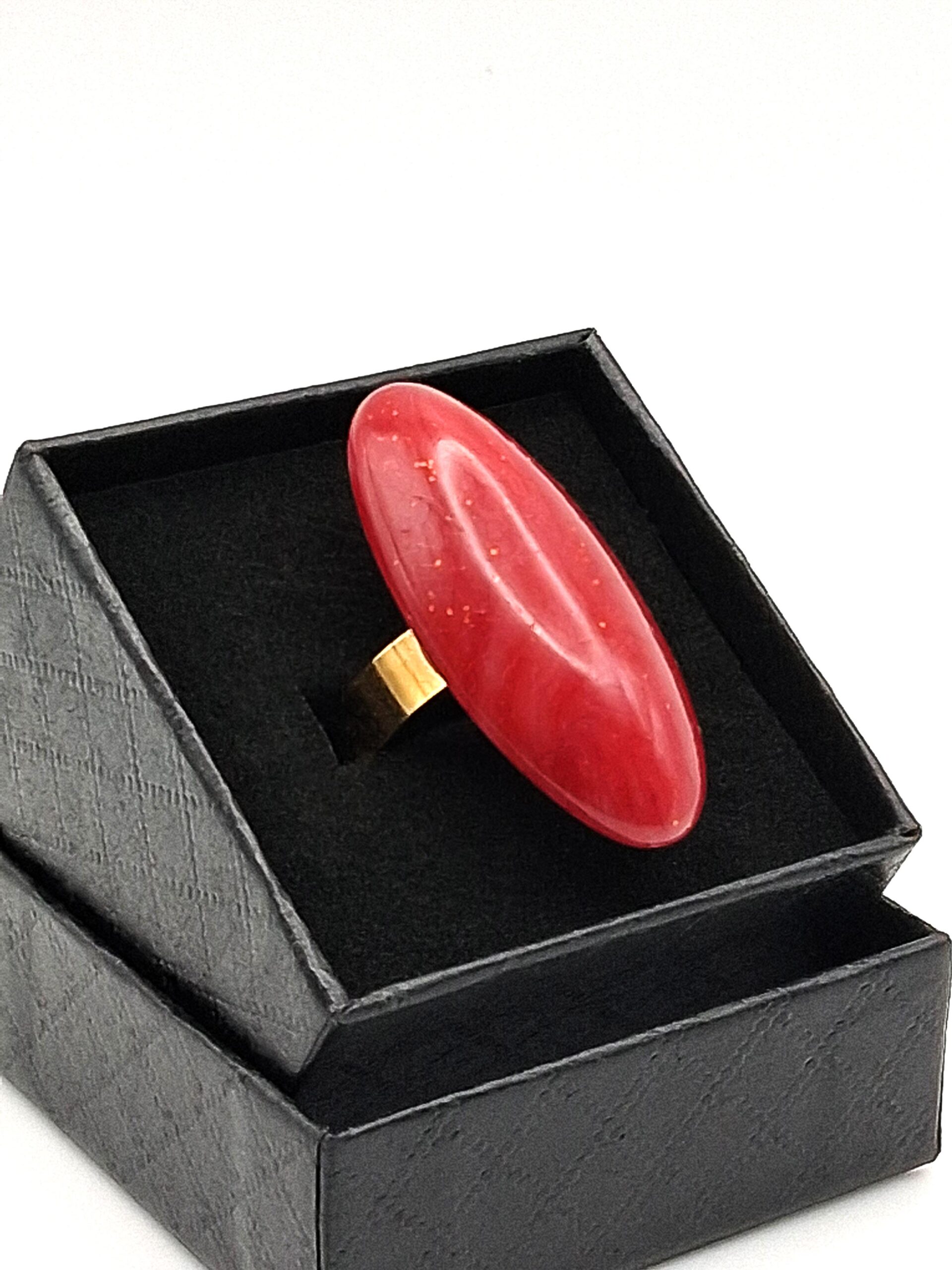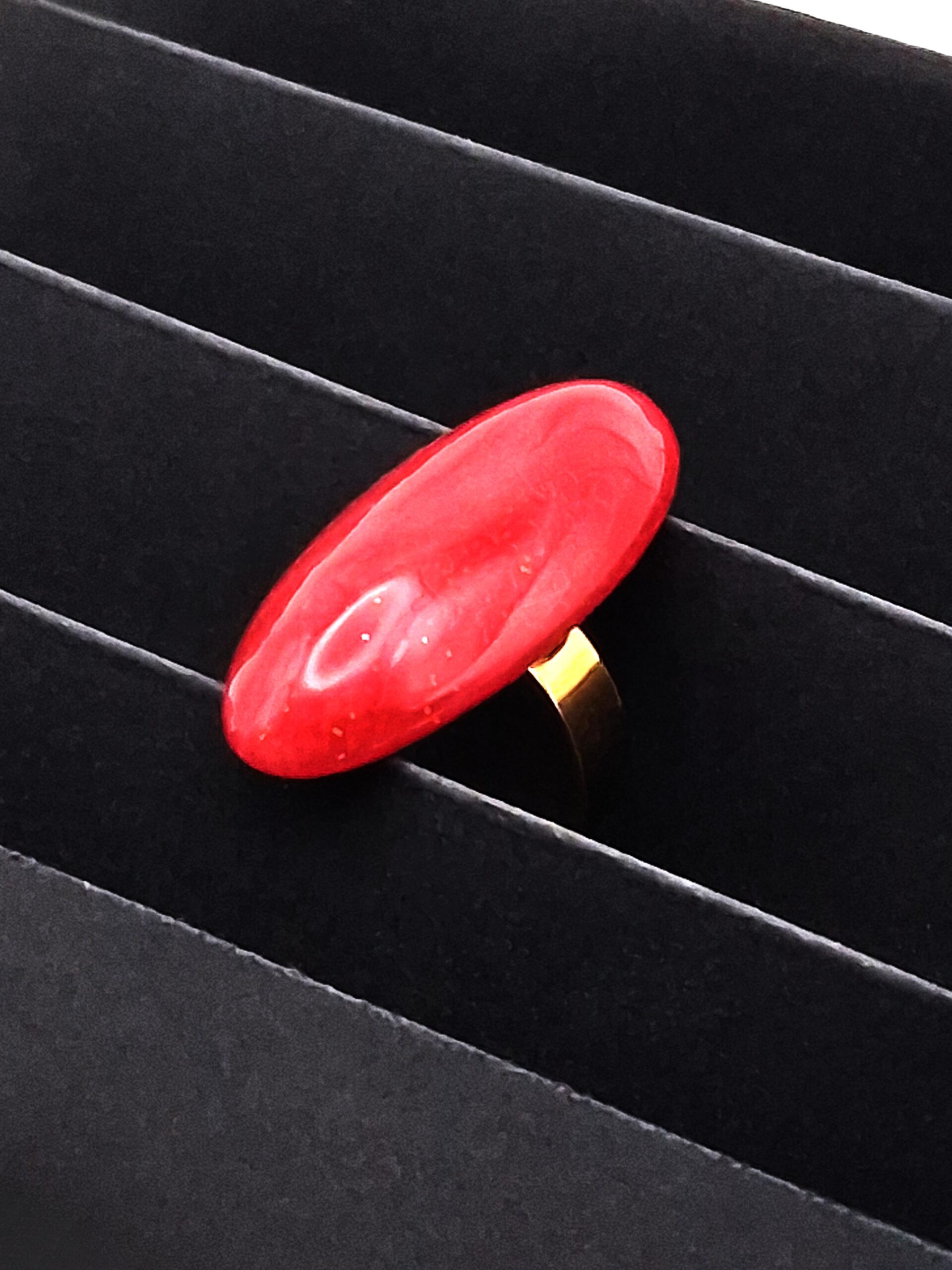 Une bague faite d’une jolie perle ovale, de belle taille, en argile polymère rouge lumineux. Monture dorée en acier inoxydable hypoallergénique ajustable.