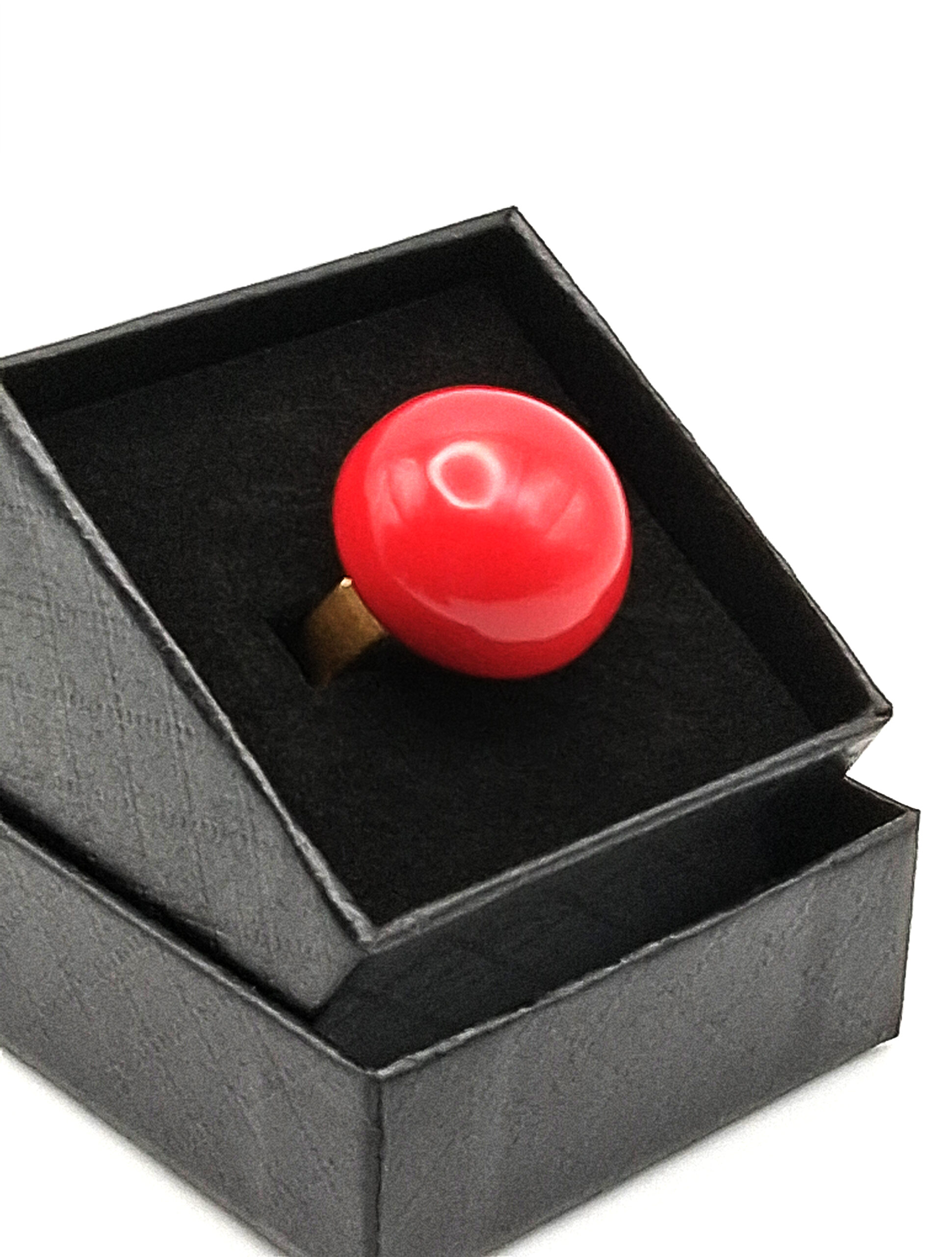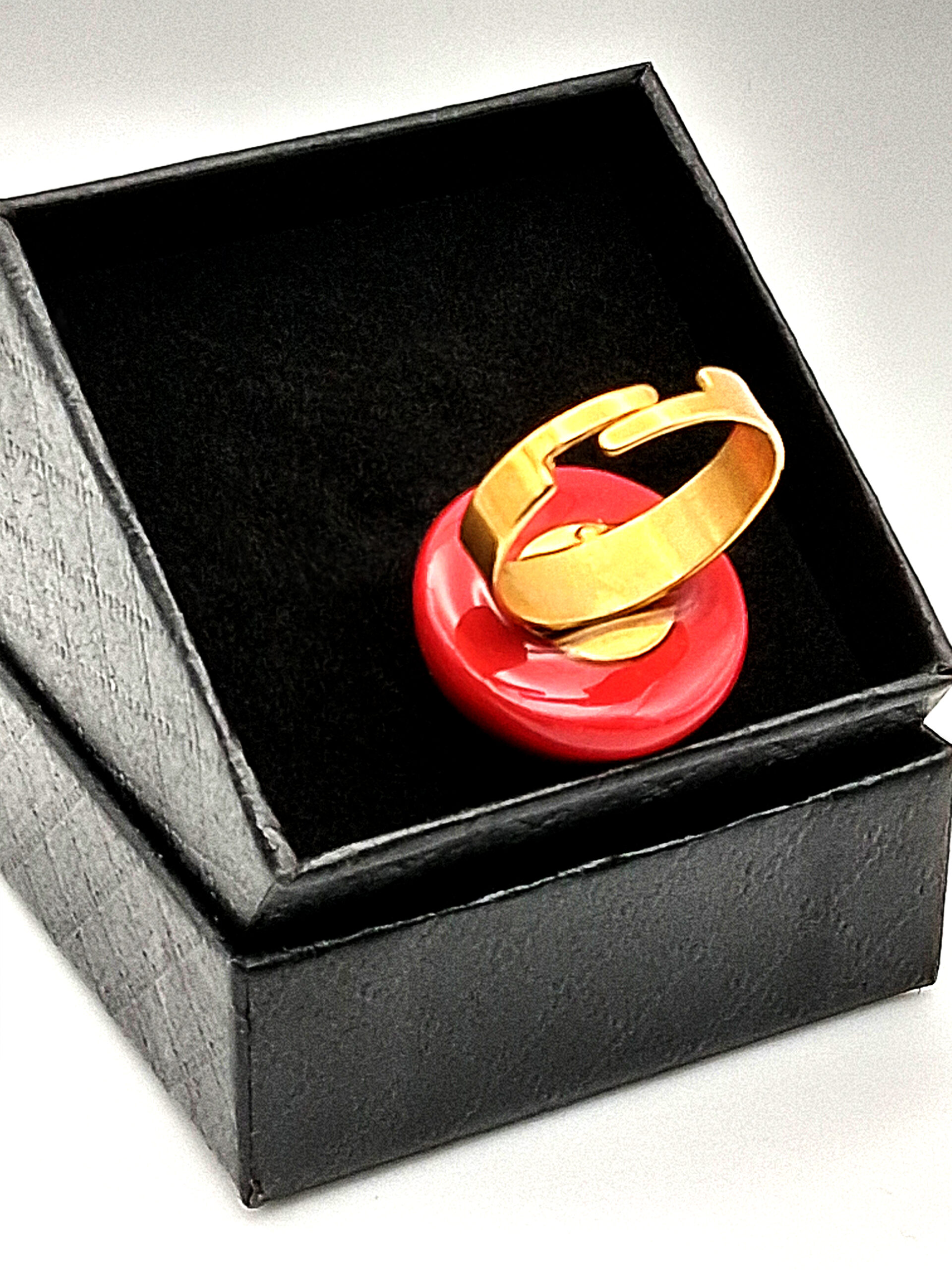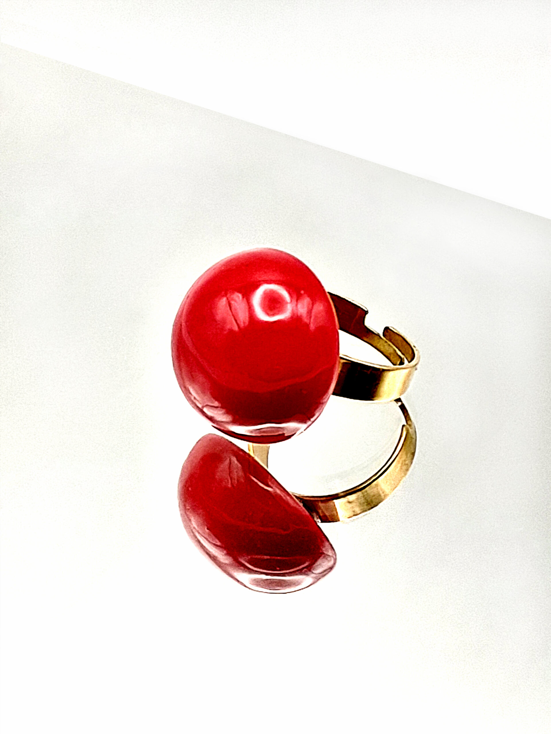 Une bague faite d’une jolie perle ronde, de belle taille, en argile polymère couleur rouge. Monture en acier inoxydable hypoallergénique ajustable.