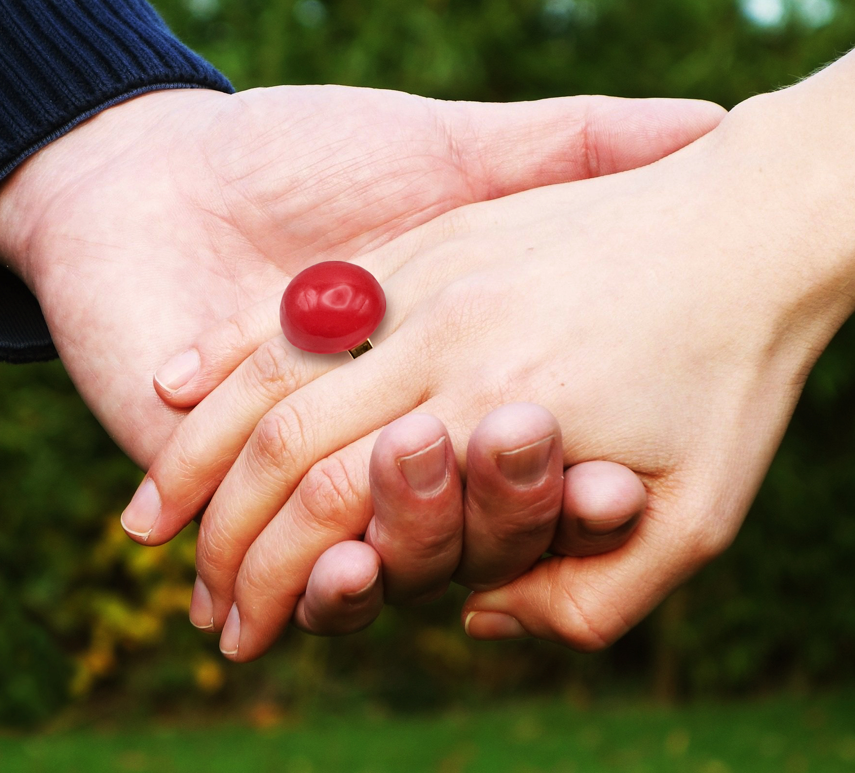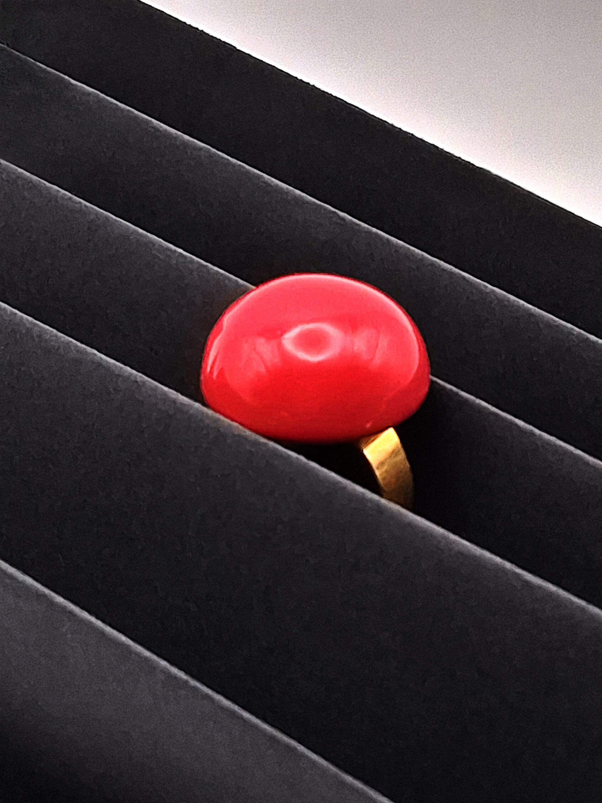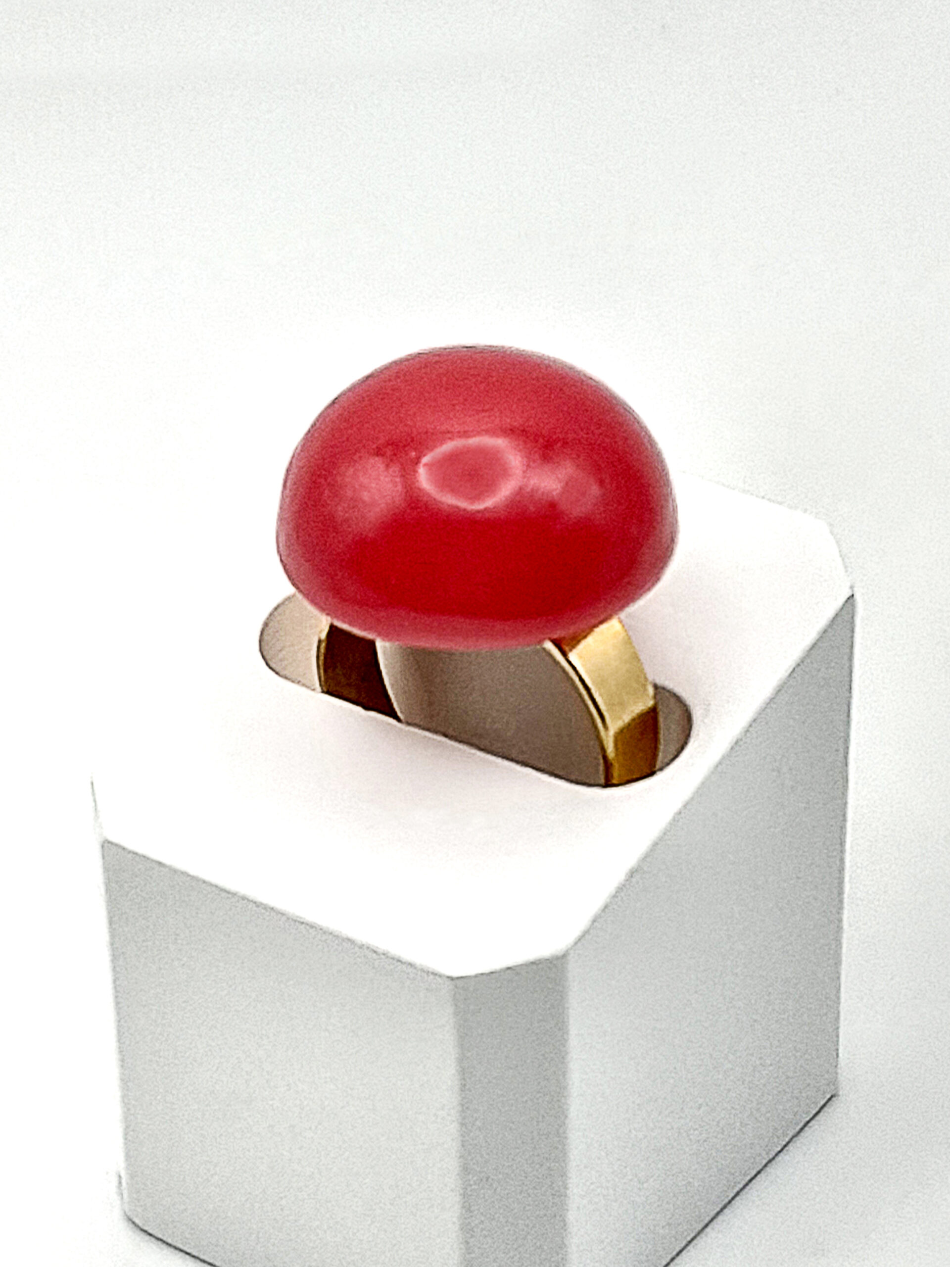 Une bague faite d’une jolie perle ronde, de belle taille, en argile polymère couleur rouge. Monture en acier inoxydable hypoallergénique ajustable.