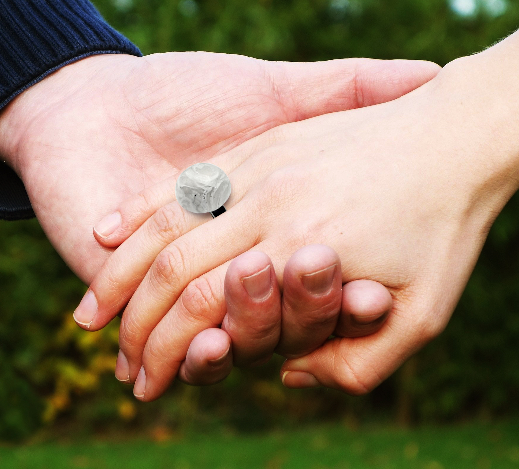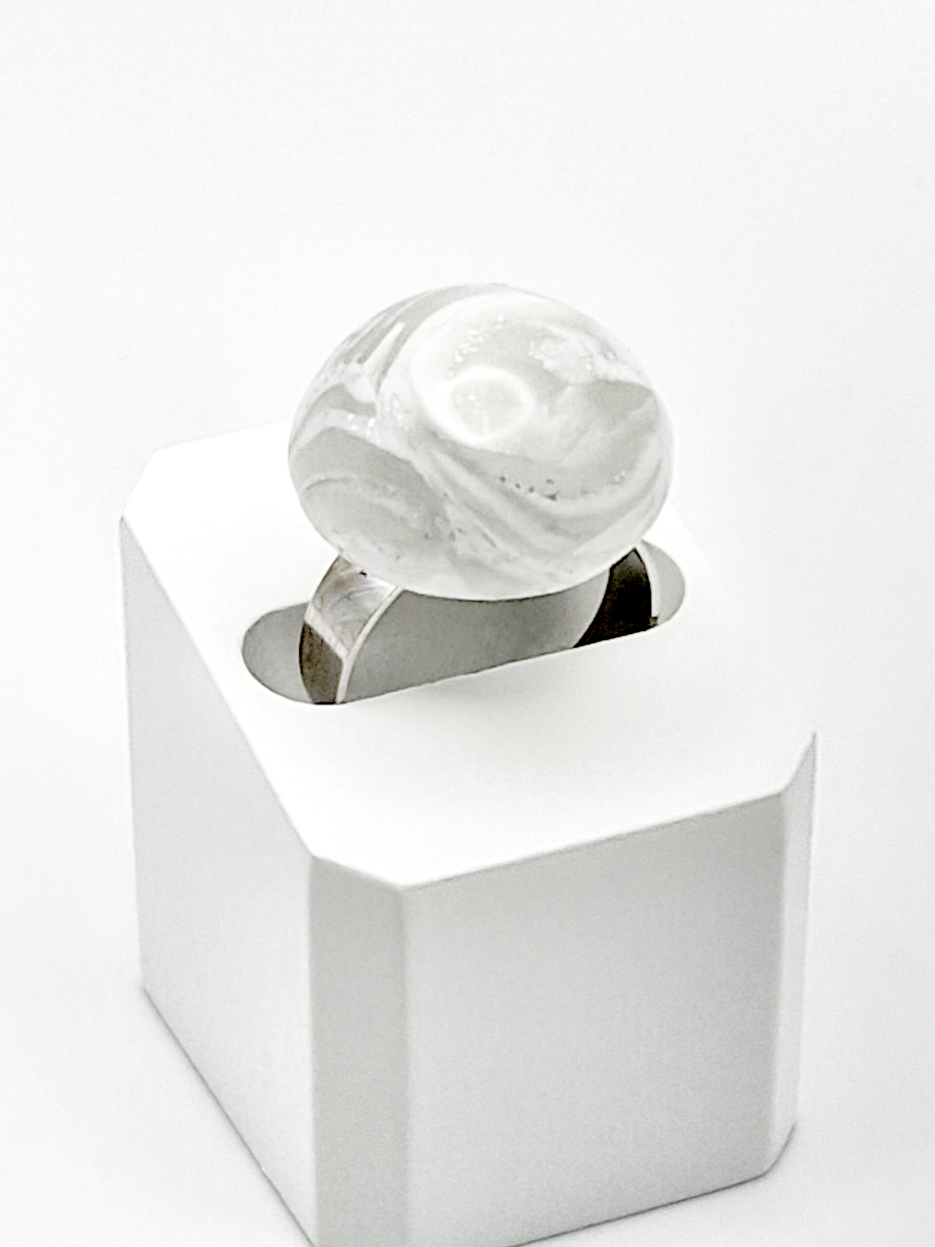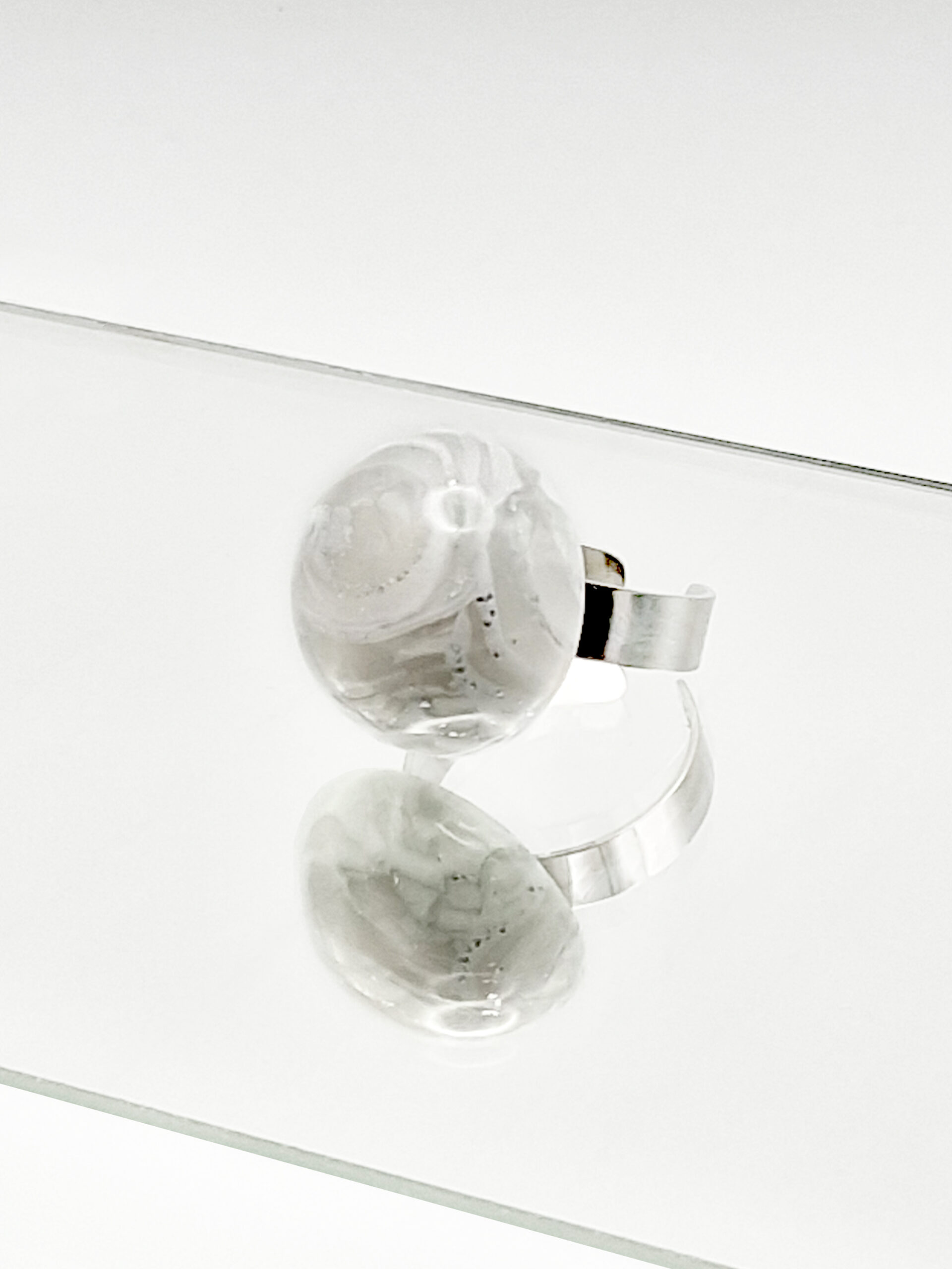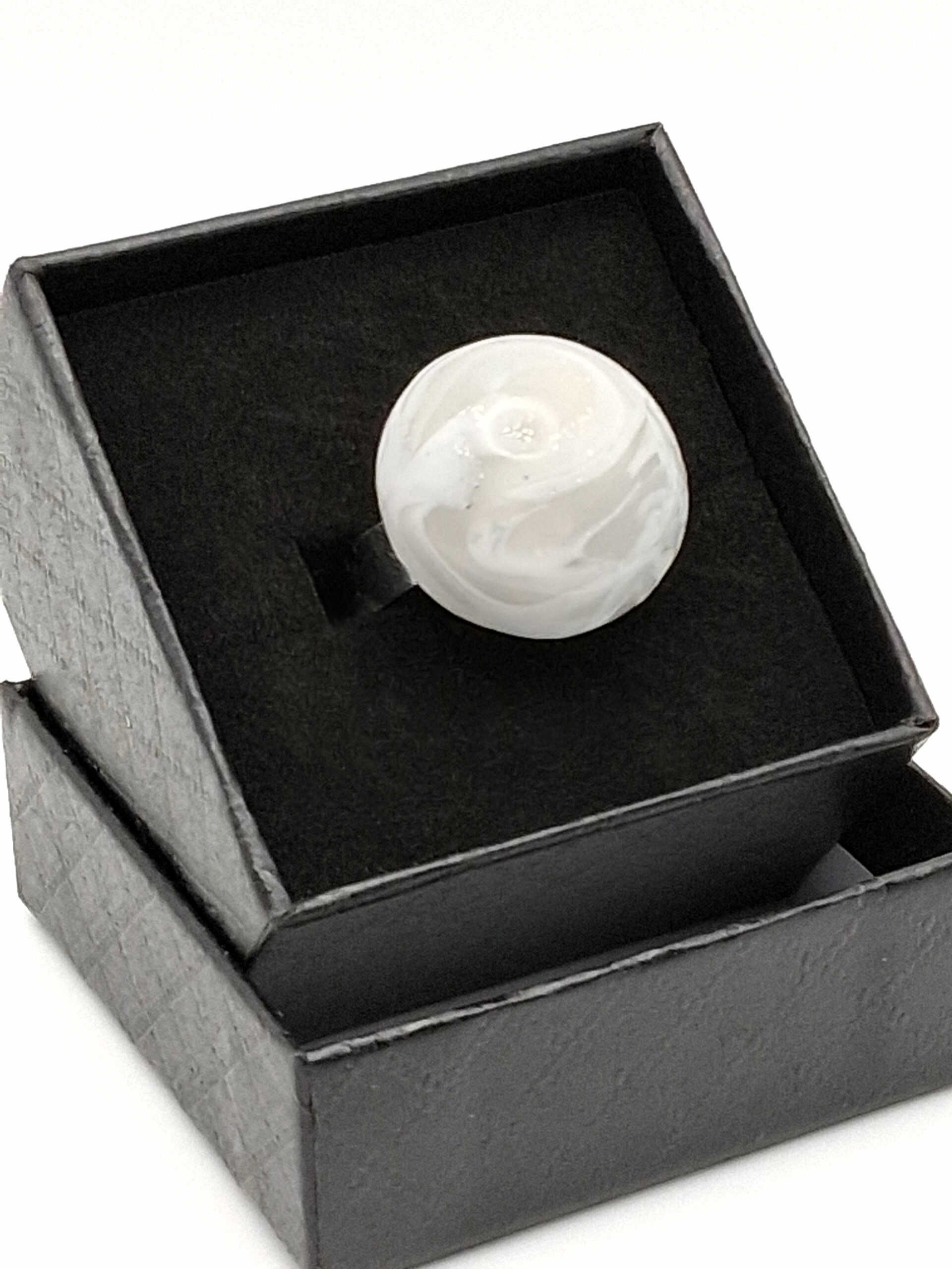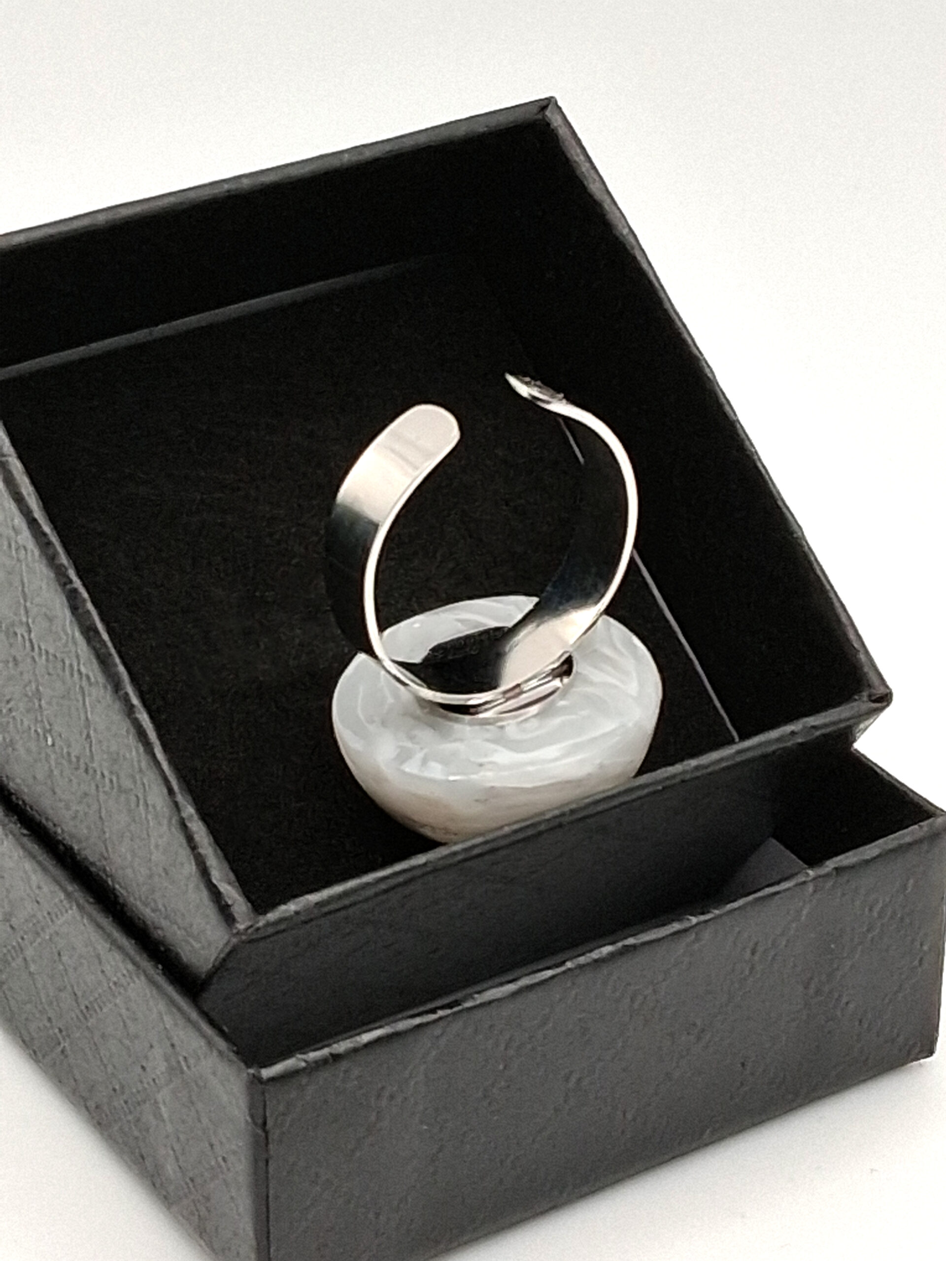 Une bague faite d’une jolie perle ronde, de belle taille, en argile polymère chamarrée blanche pailletée. Monture en acier inoxydable hypoallergénique ajustable.