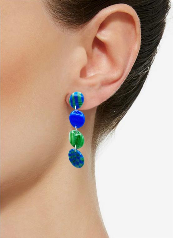 Des boucles d’oreille faites d’un assemblage de 4 jolies perles rondes motifs rayures et damier bleu roi et vert marbré translucentes. Clous d’oreilles en acier inoxydable hypoallergénique.