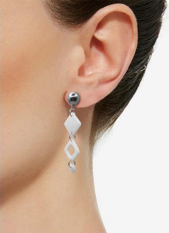 Des boucles d’oreille faites d’un assemblage de 3 jolies perles blanches carrées et rondes. Clous d’oreilles en acier inoxydable argent hypoallergénique.