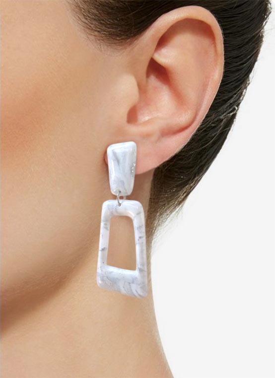 Des boucles d’oreille faites d’un assemblage de 2 jolies perles motif marbré blanc et paillettes argentées en forme de trapèze. Clous d’oreilles en acier inoxydable hypoallergénique.