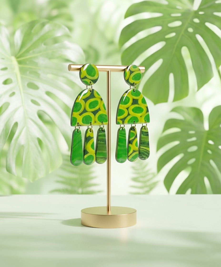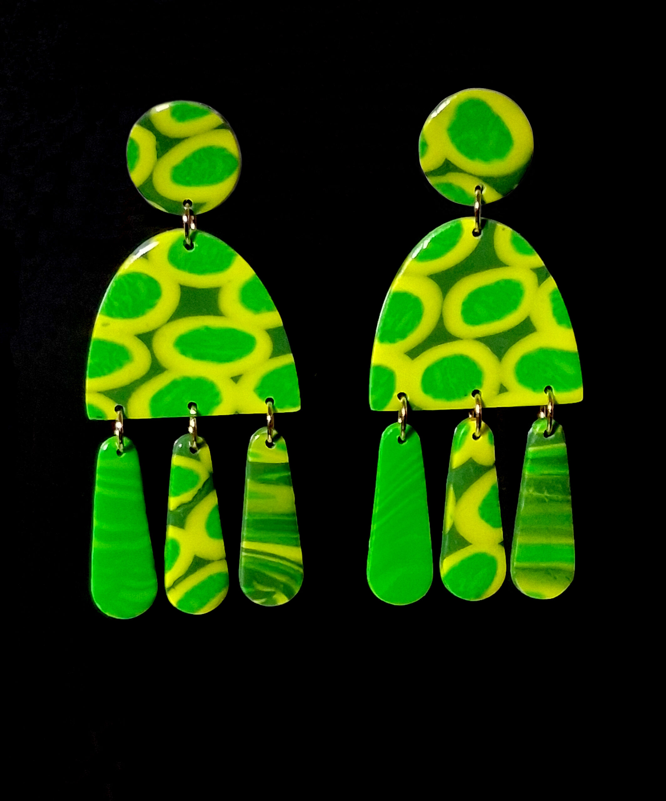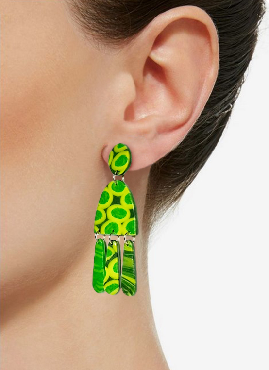 - La partie pendante : Une forme géométrique habillée d’un motif vert et jaune.