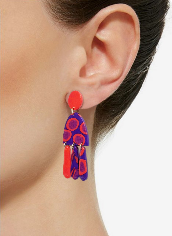 • La partie pendante : Une forme géométrique habillée d’un motif bleu et rouge.