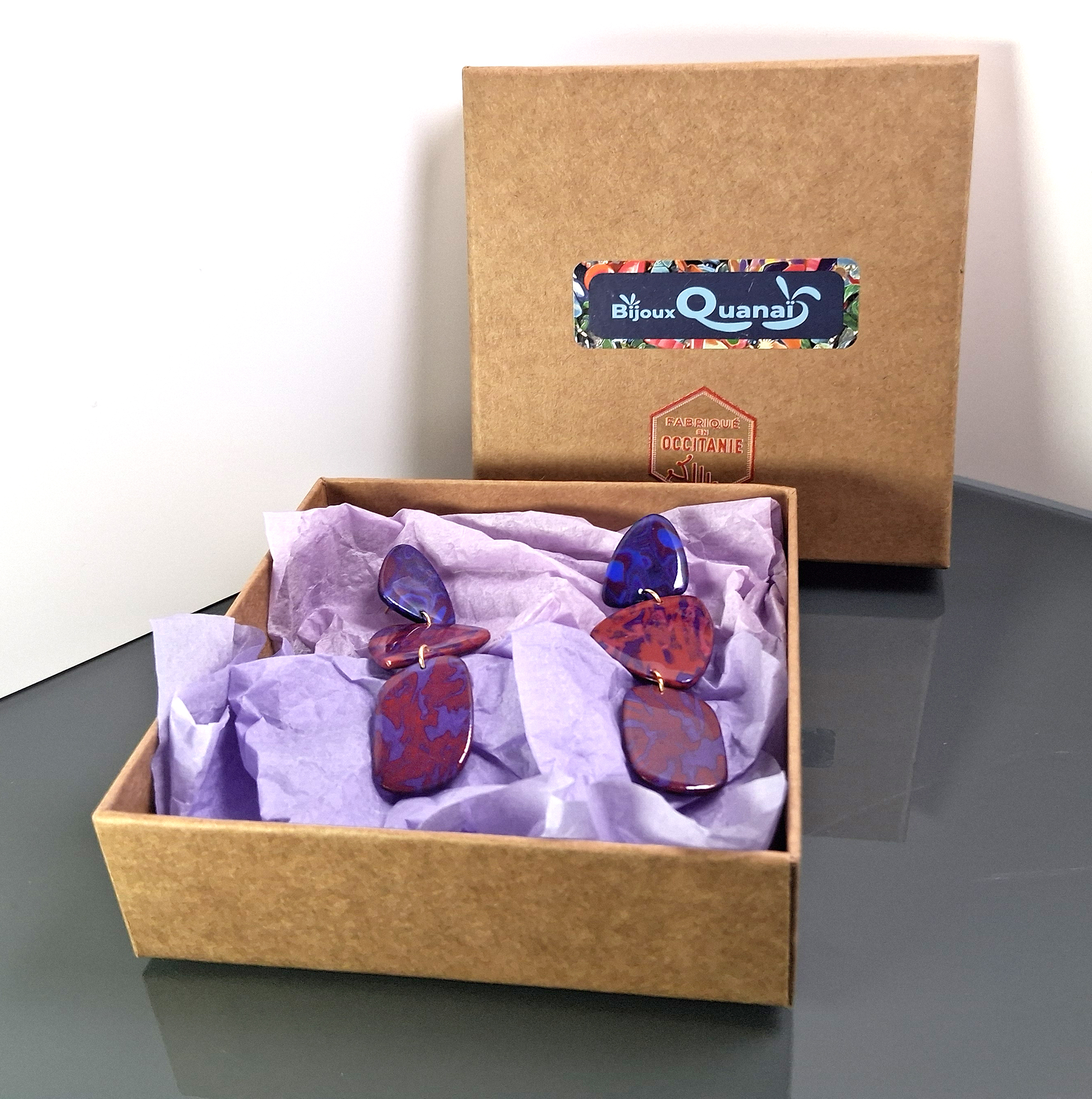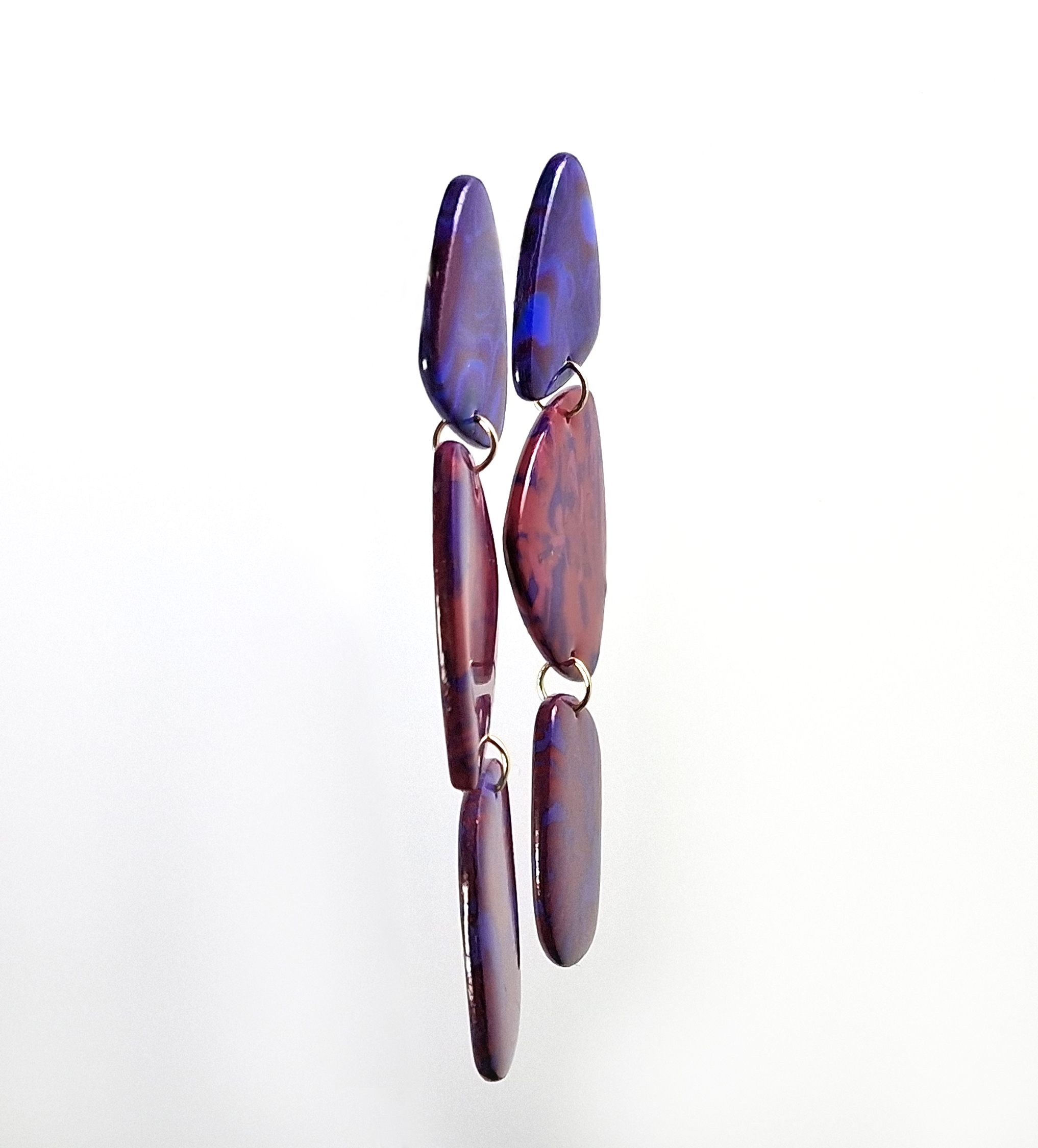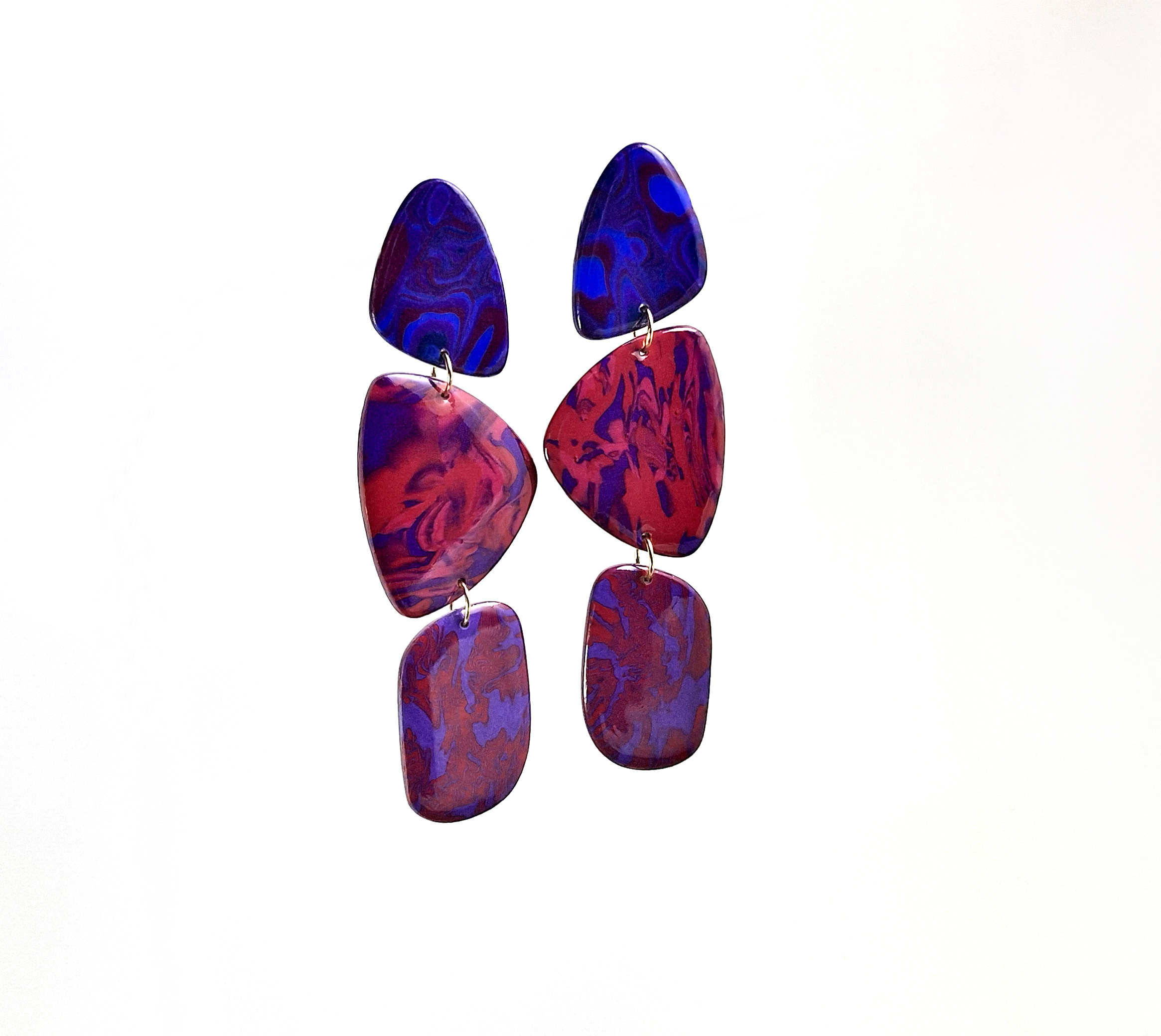 Choisissez l’audace avec ces boucles d’oreilles uniques, entièrement façonnées à la main dans mon atelier. Le motif tourbillonnant dans des tons riches de violet, de rouge et d’une touche de bleu électrique capte la lumière et les regards, ajoutant une touche de couleur et d’originalité à n’importe quelle tenue.