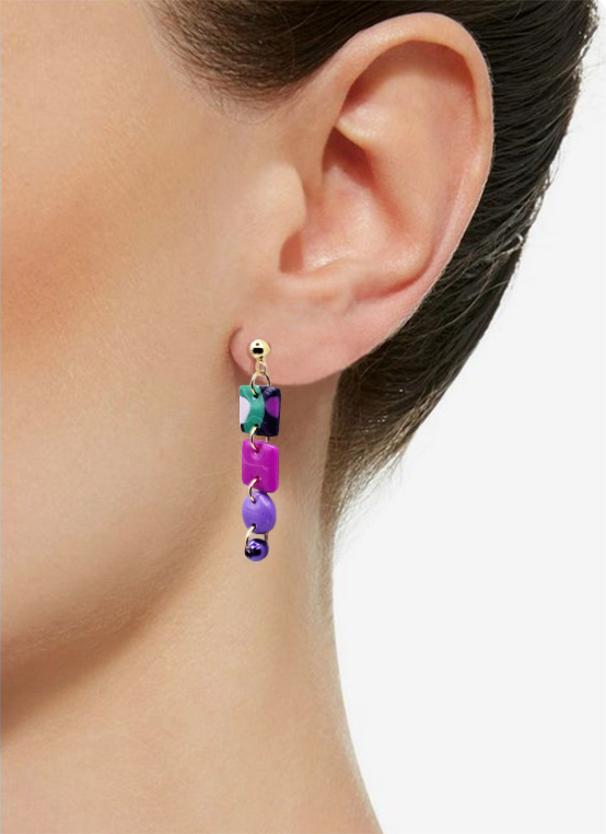 Des boucles d’oreille faites d’un assemblage de 3 petites perles carrées et rondes, motif coloré fuchsia, parme, vert et aubergine. Clous d’oreille en acier inoxydable hypoallergénique.