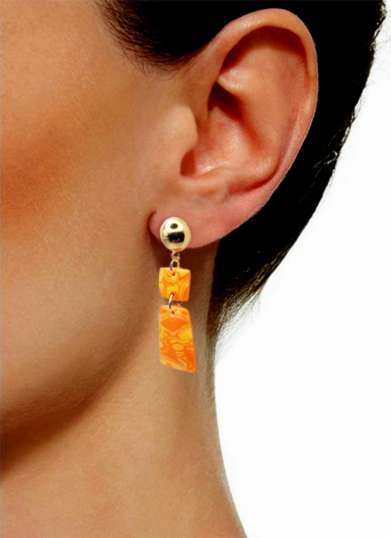 Des boucles d’oreille faites d’un assemblage de 2 perles carrées, motif coloré jaune orangé. Clous d’oreille en acier inoxydable hypoallergénique.