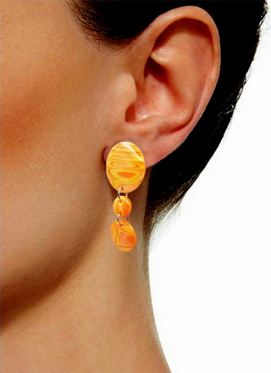 Des boucles d’oreille faites d’un assemblage de 3 perles rondes, motif coloré jaune orangé. Clous d’oreille en acier inoxydable hypoallergénique.