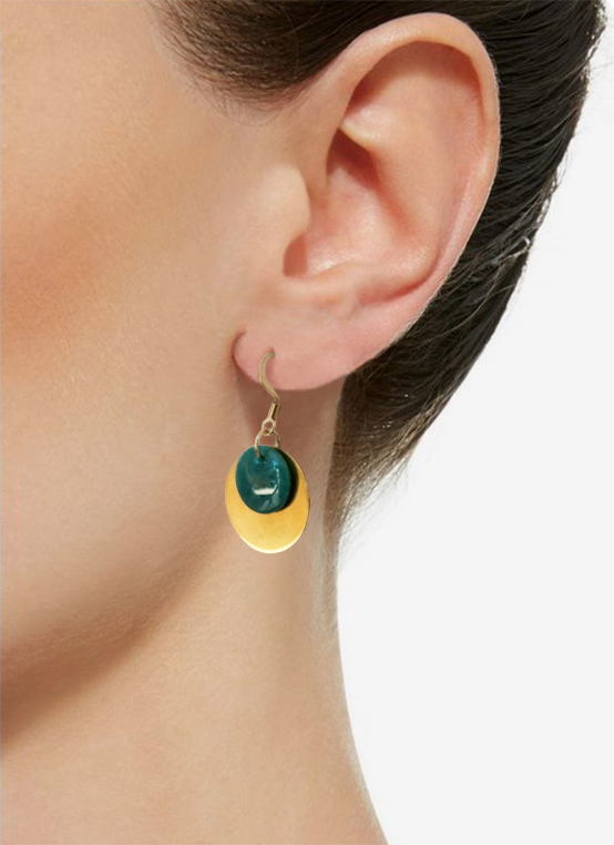Des boucles d’oreille faites d’un assemblage d’une jolies perles turquoises et d’une breloque en forme de disque en acier inoxydable doré. Crochets d’oreille en acier inoxydable hypoallergénique.