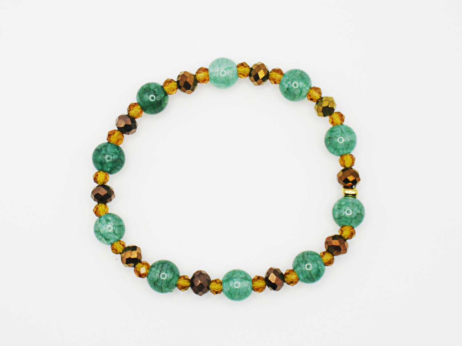 Bracelet fait de perles en pierre naturelle vertes transparentes et perles de verre bronzes, petites perles de verre ambre clair, montées sur un fil élastique résistant.