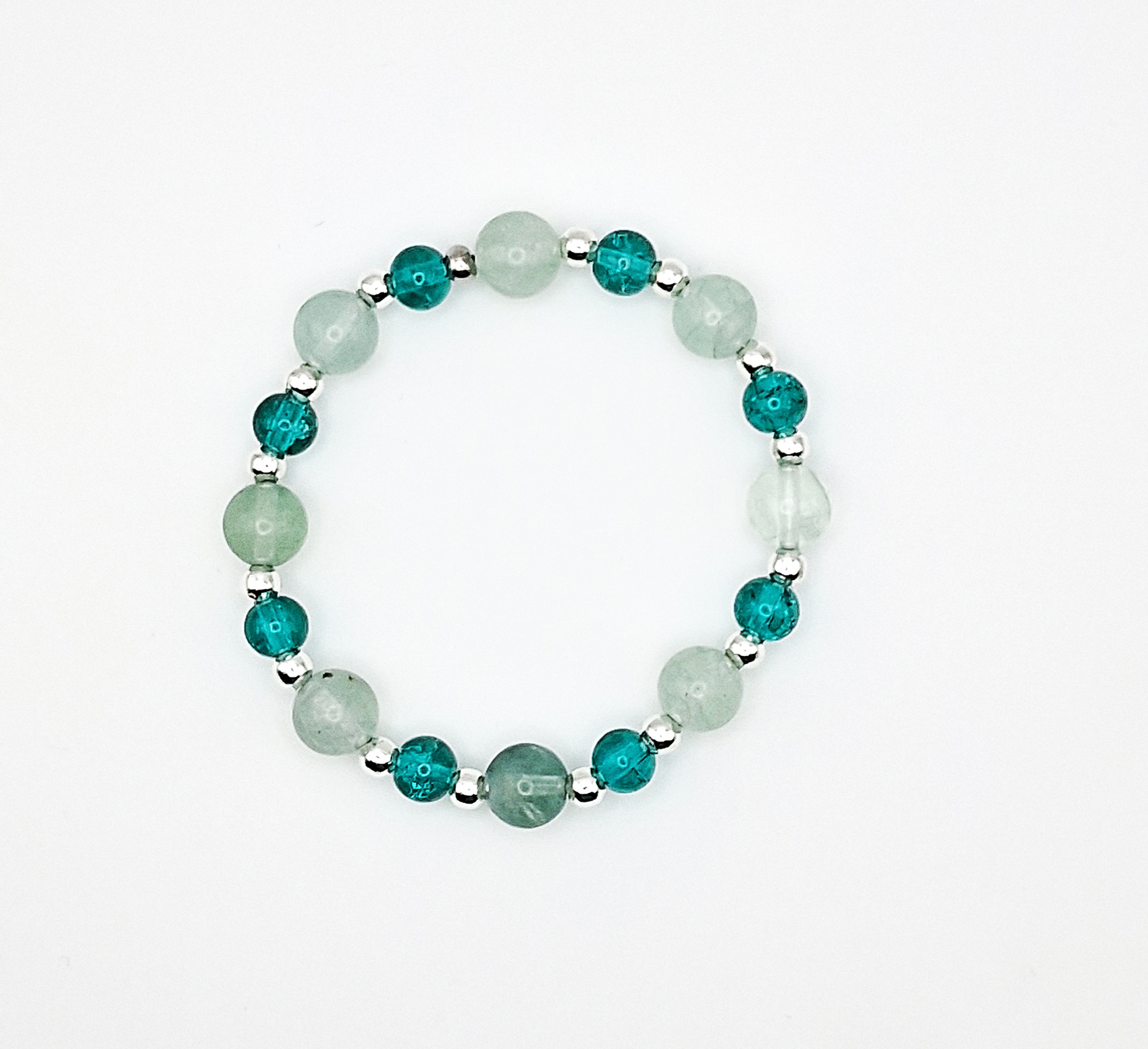 Bracelet fait de perles de verre vert d’eau et turquoise, intercalaires rondes en acier inoxydable argent. Bracelet monté sur élastique 0,7 mm résistant.