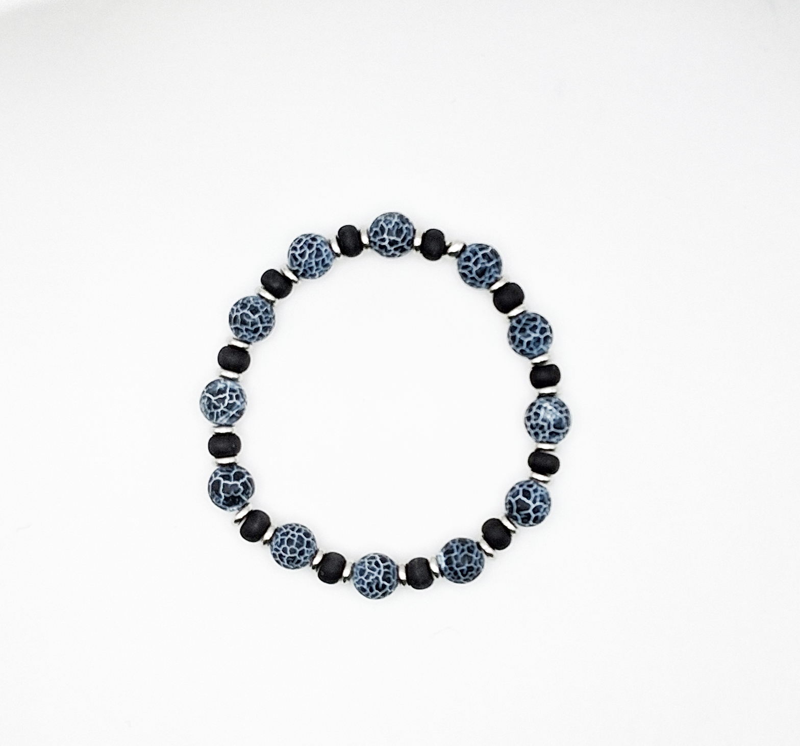 Bracelet fait de Perles D’Agate Craquelées bleues et perles en bois, intercalaires en acier inoxydable argent. Bracelet monté sur élastique 0,7 mm résistant.