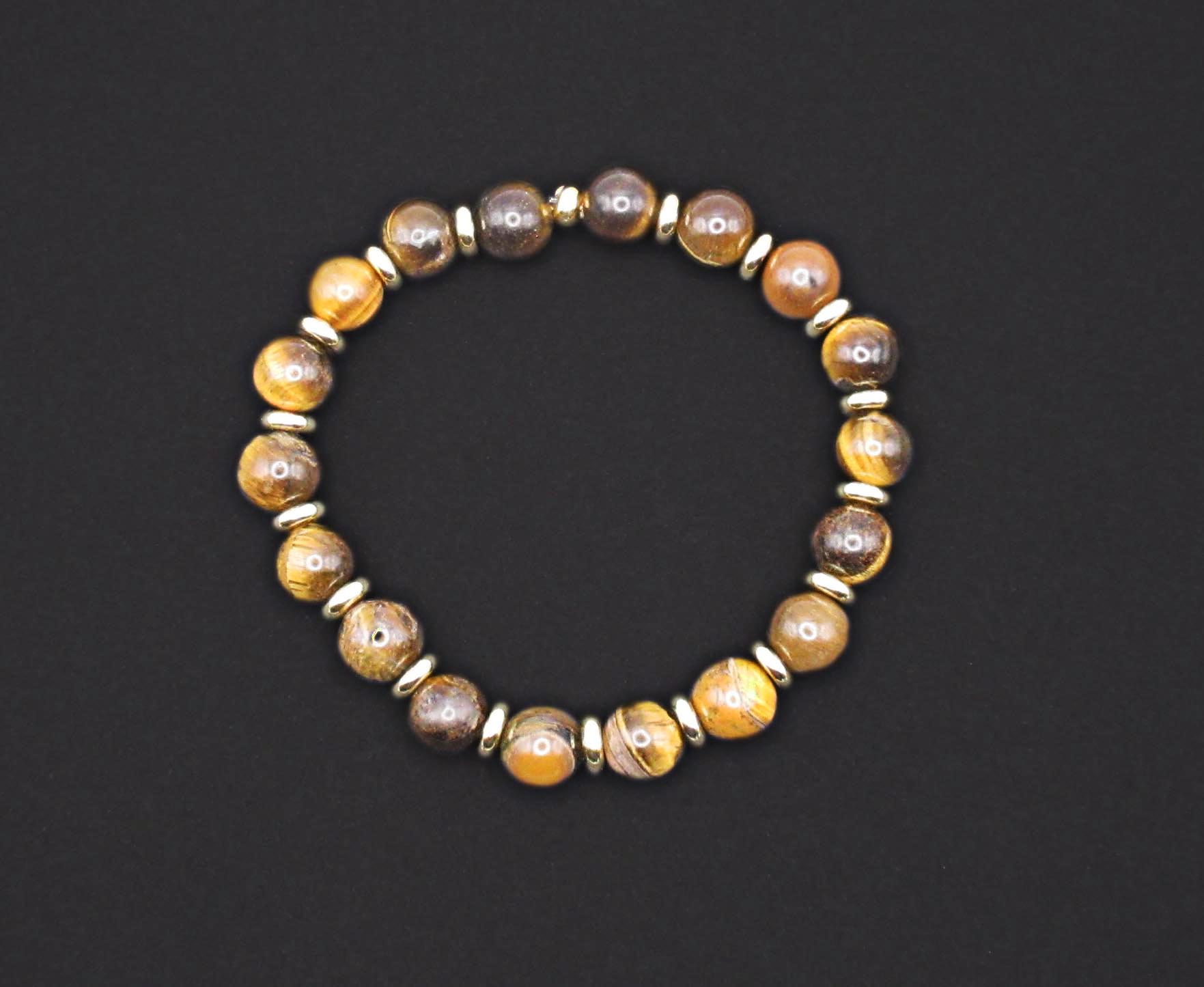 Bracelet fait de perles de verre œil de tigre, intercalaires en acier inoxydable dorées.