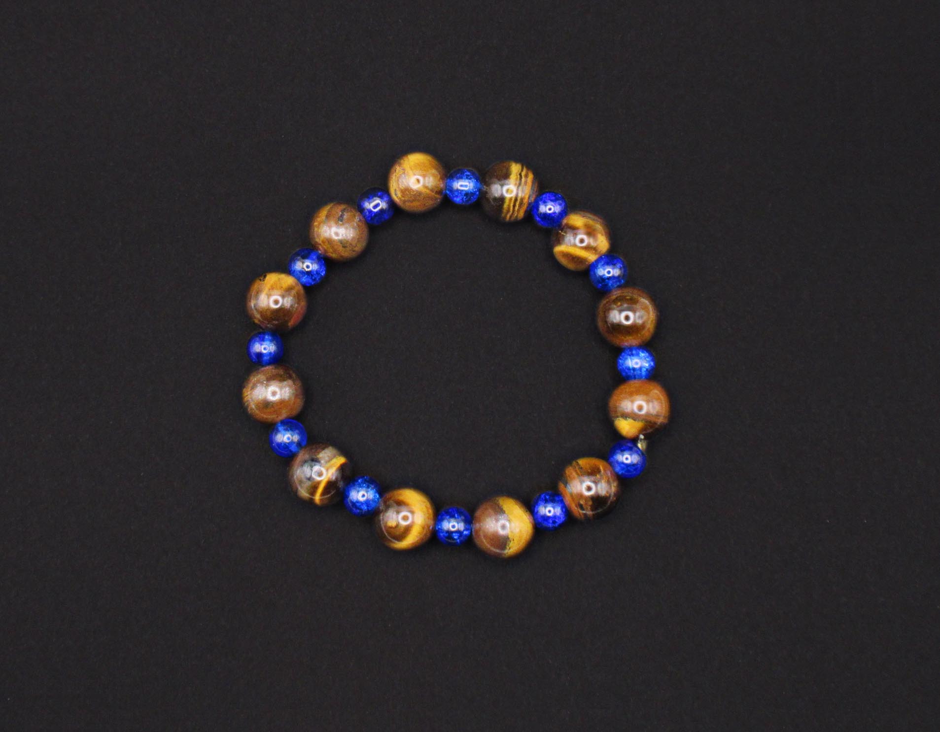 Bracelet fait de perles de verre œil de tigre et perles bleues.