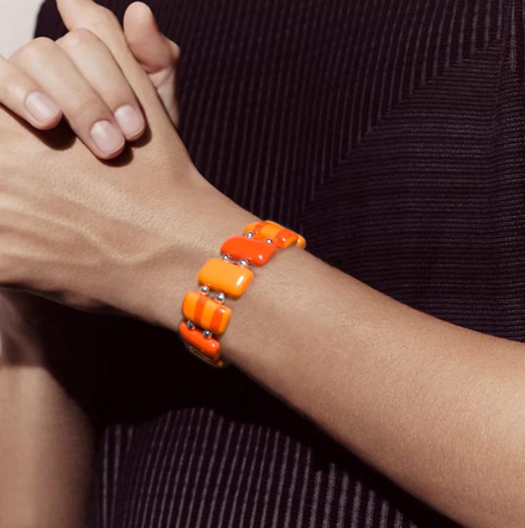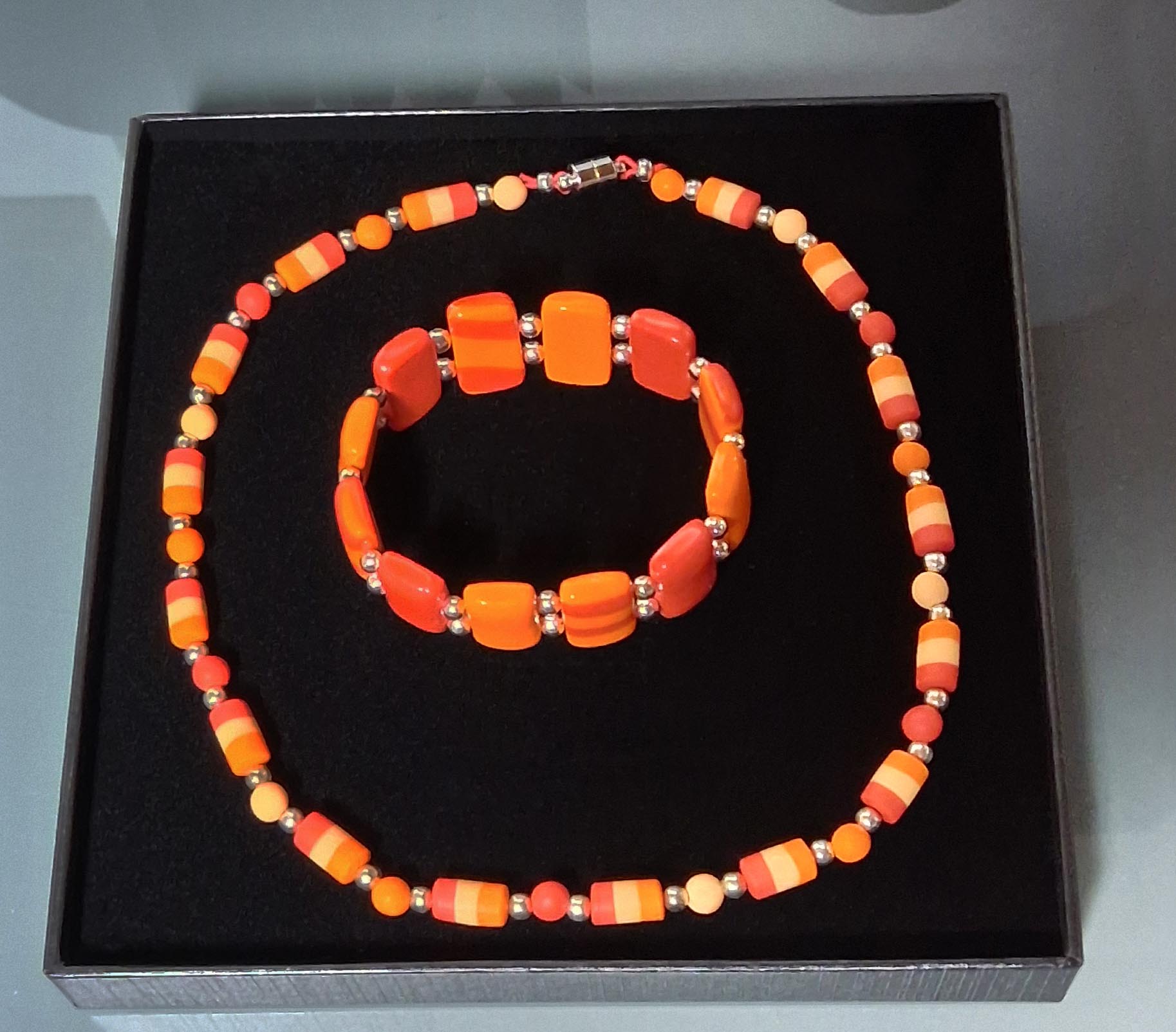 Une parure faites d’un collier ras de cou (diamètre 42 cm) et d’un bracelet en argile polymère de plusieurs nuances oranges. perles intercalaires en acier inoxydable.