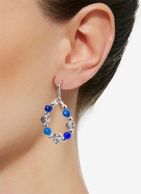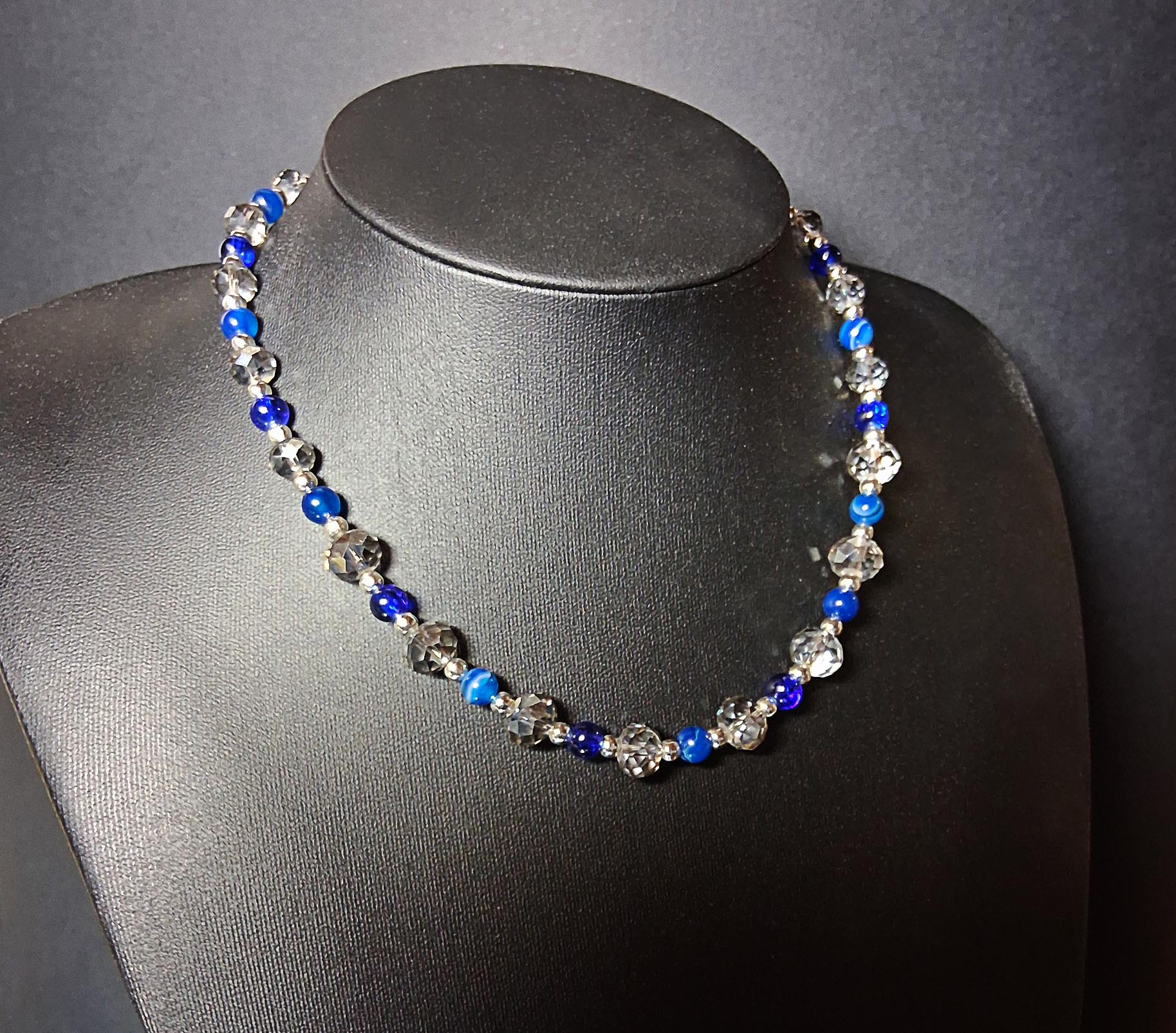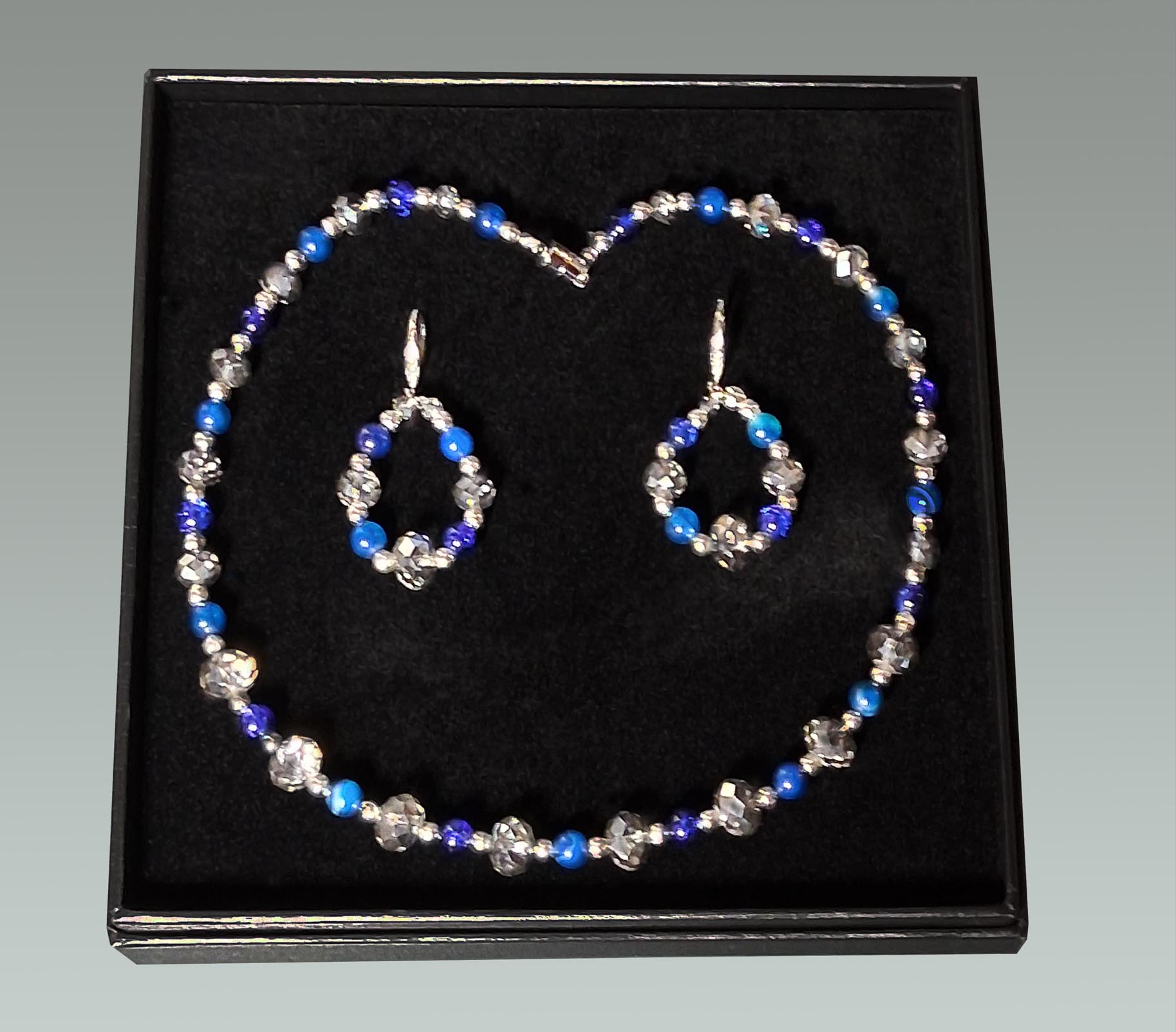 Une parure faites d’un collier ras de cou (diamètre 42 cm) et d’une paire de boucles d’oreille. Perles en verre bleu outremer, perles à facettes en cristal de verre, perles intercalaires en acier inoxydable.